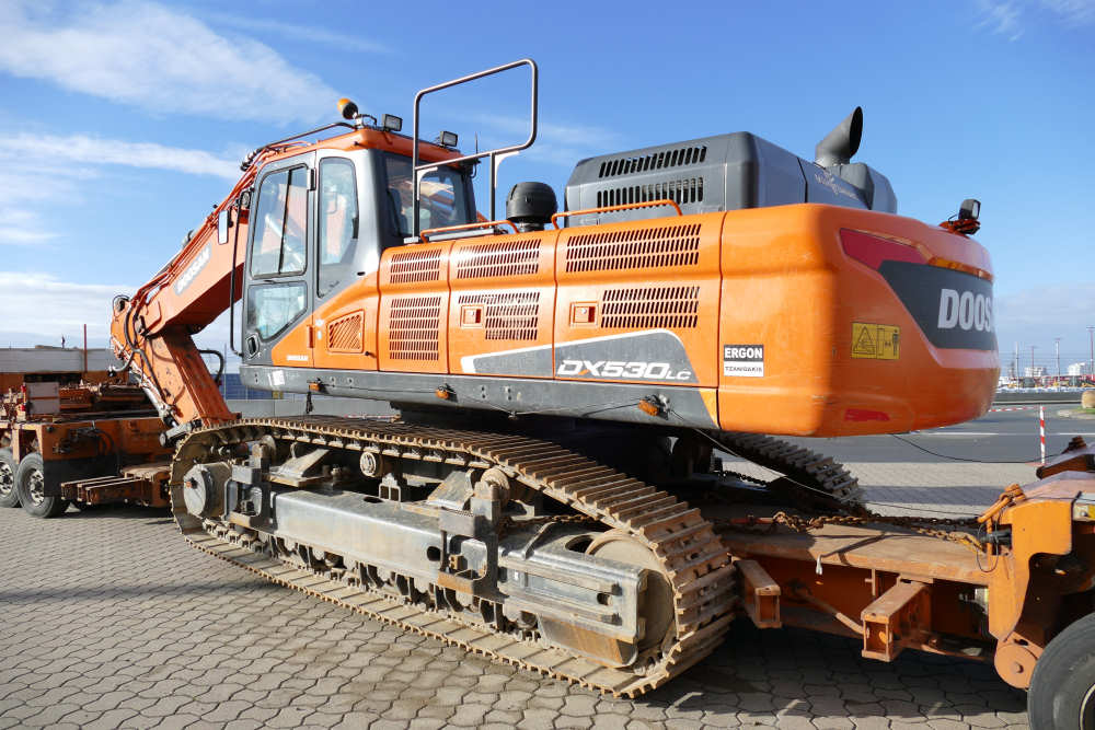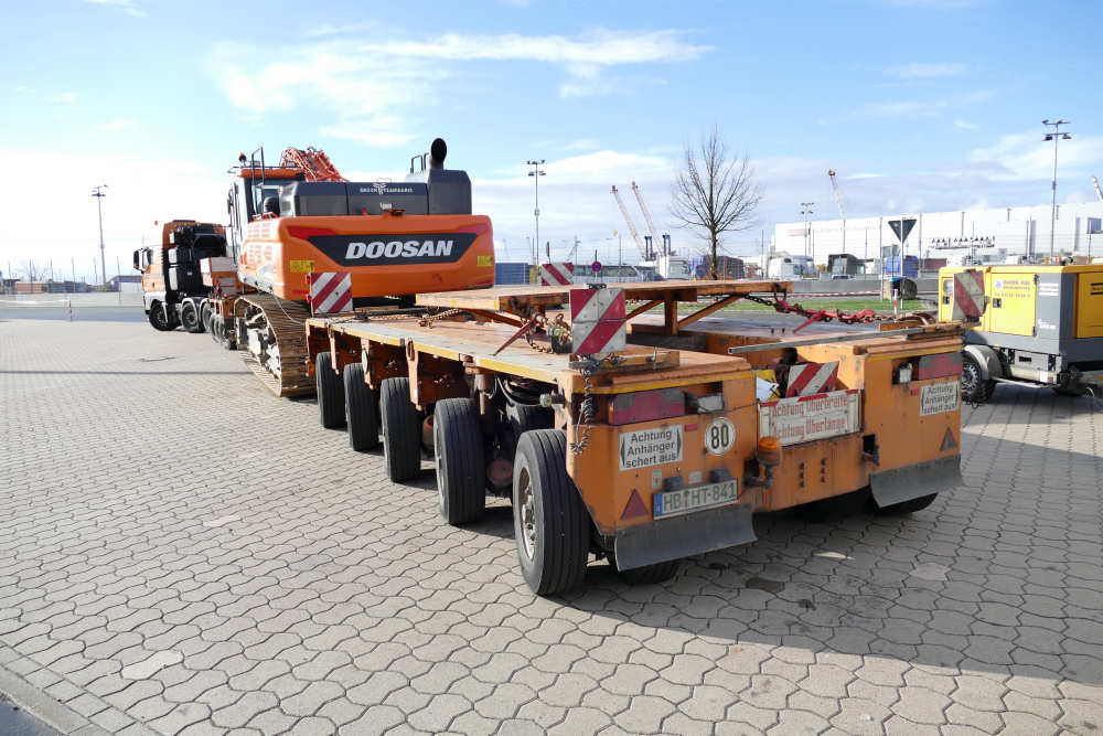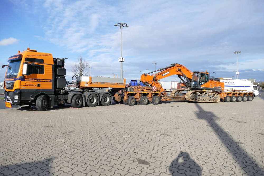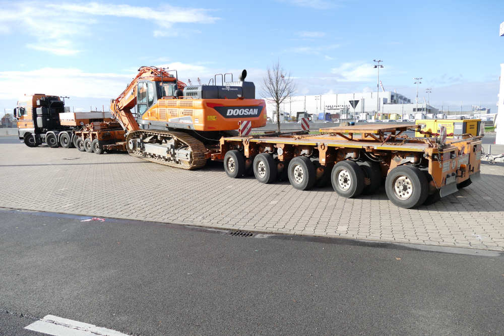 MAN 41.560 TGX mit Goldhofer THP XLE 3-5 Baggerbrücke und Doosan DX530 Hydraulikbagger