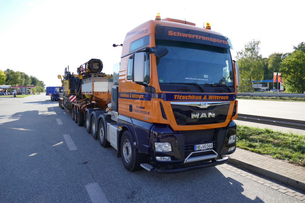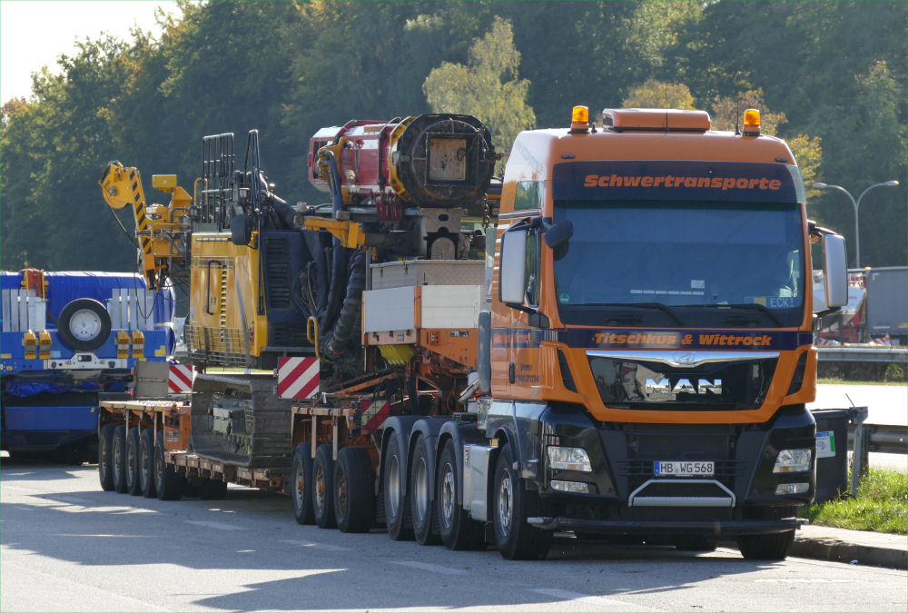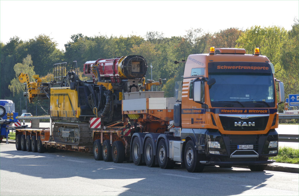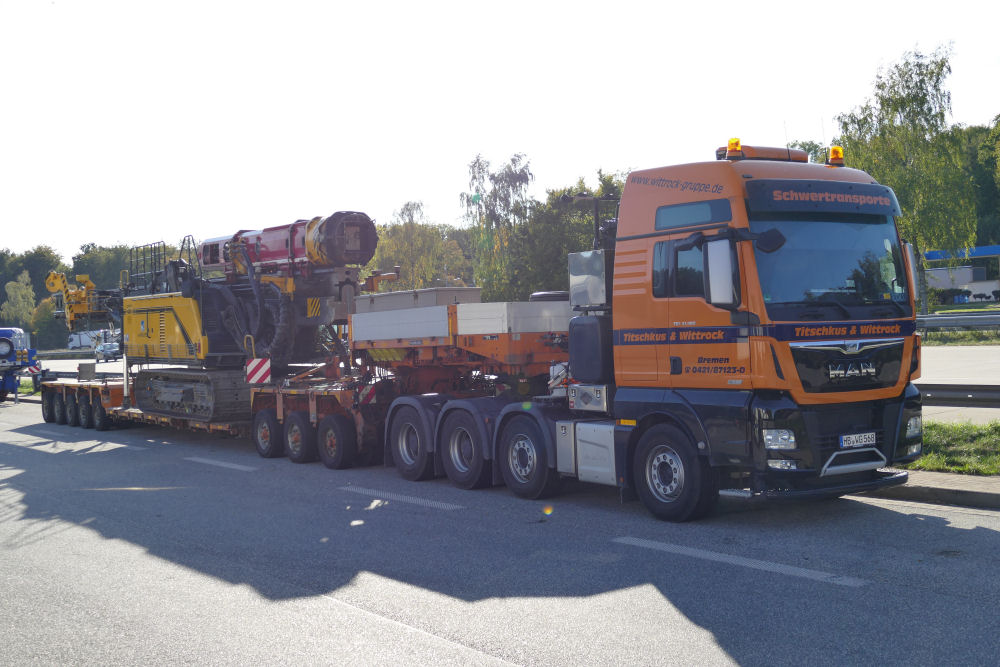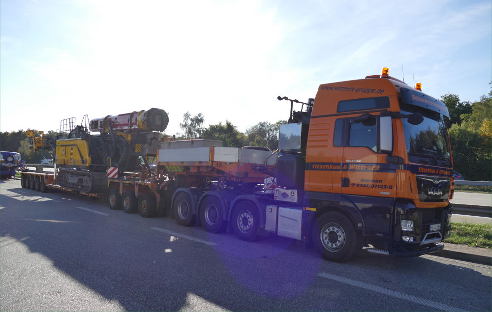 MAN 41.560 TGX mit Goldhofer THP XLE 3-5 Tieflader und Junttan PMX 24 Ramme