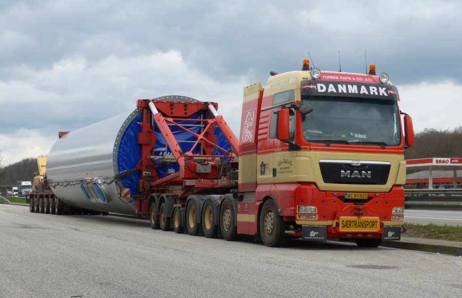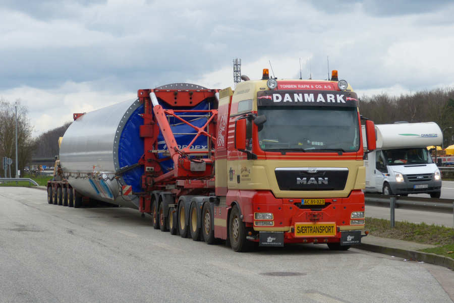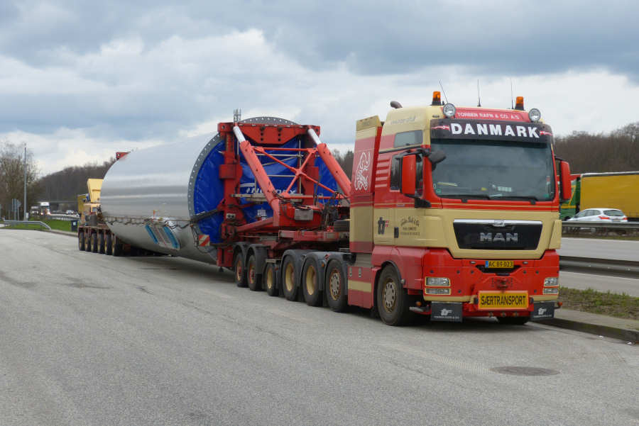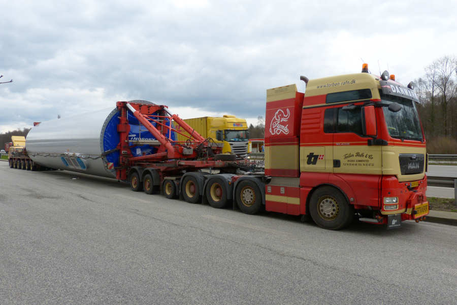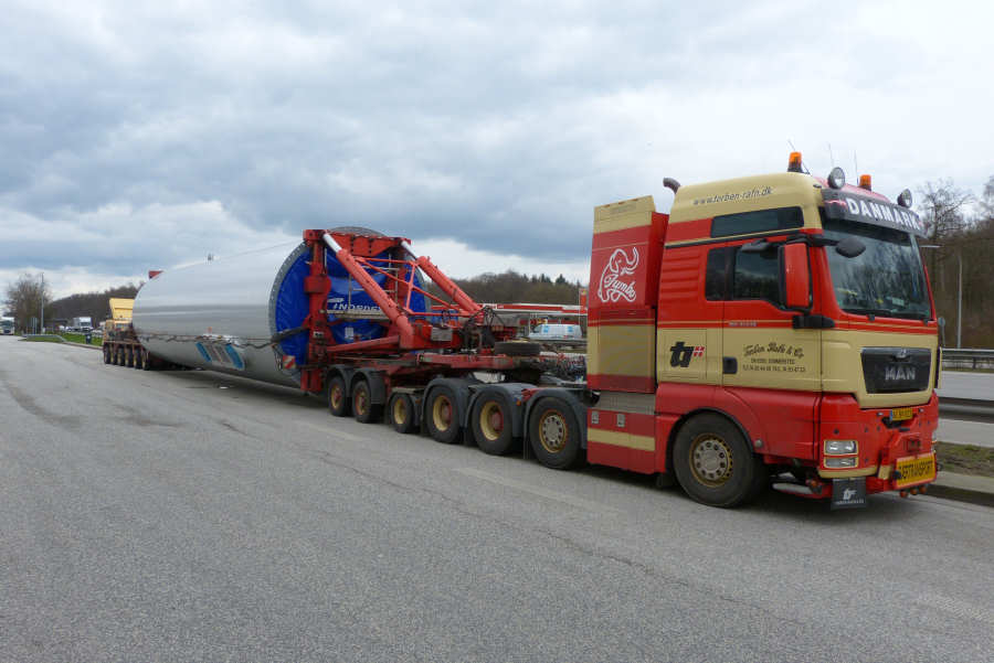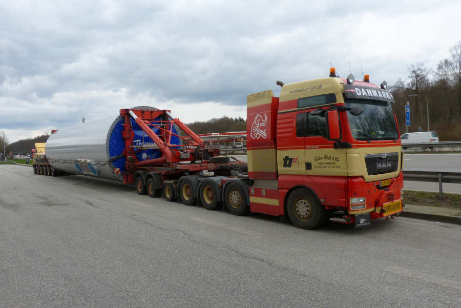 MAN 41.540 TGX mit großer Goldhofer  Turmadapterkombination und WEA Bodensektion