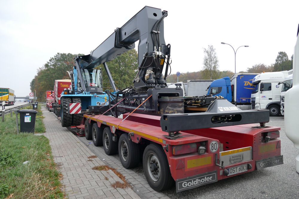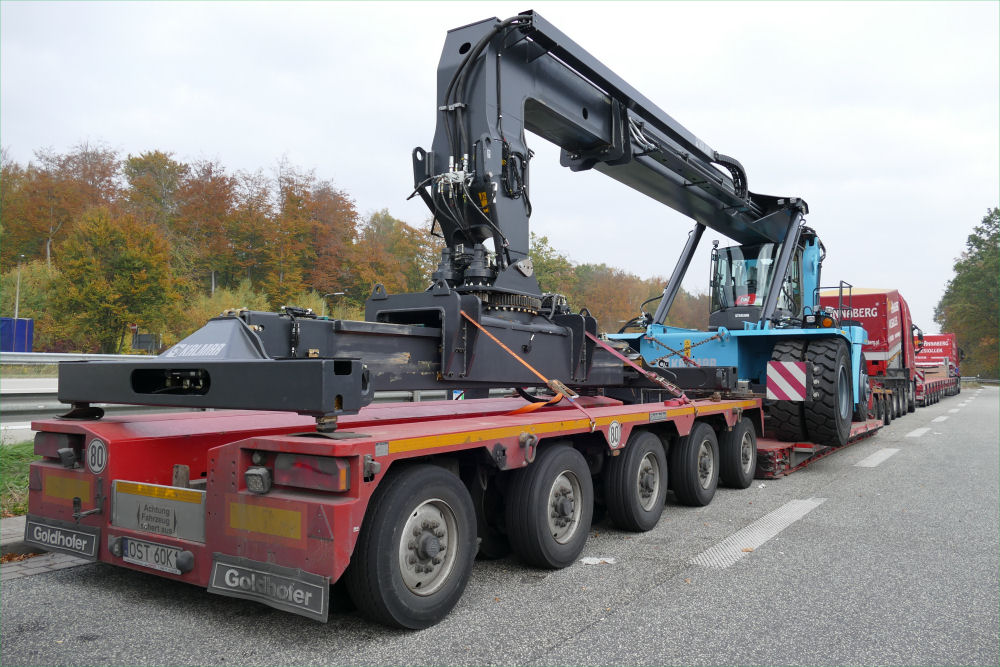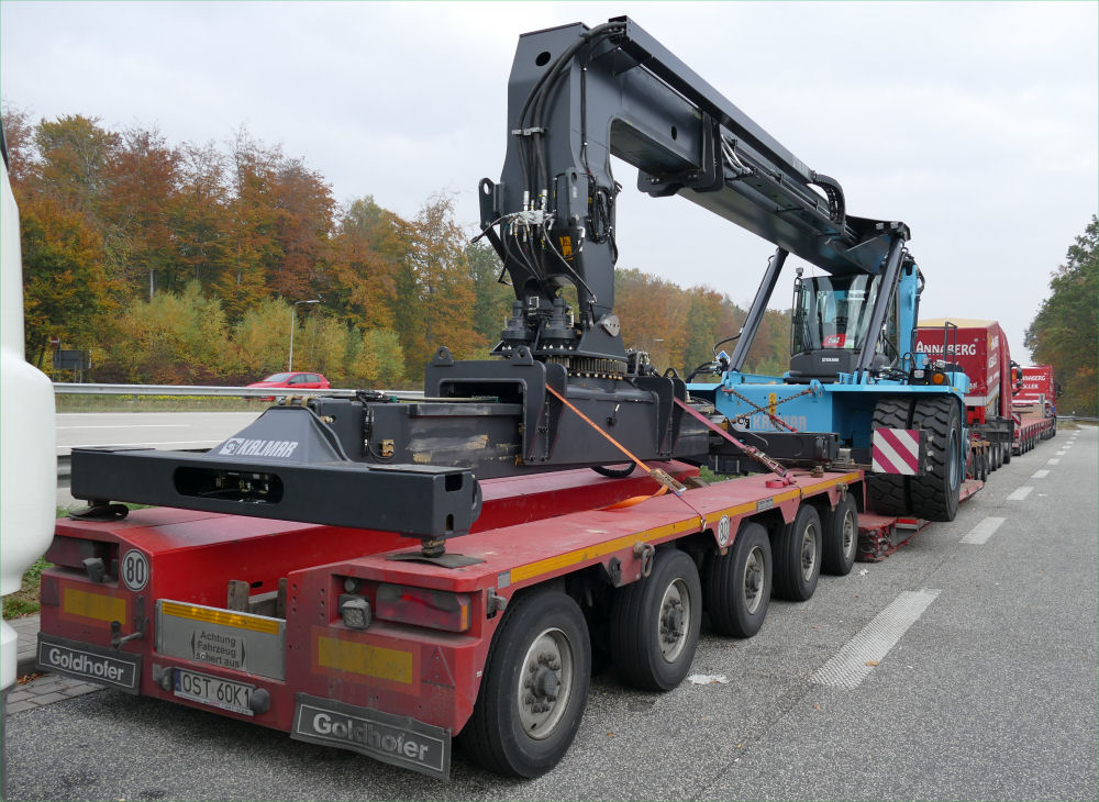 Volvo FH 16 750 8x4 mit Goldhofer 3-5 Tieflader und Kalmar DRG 100 Reachstacker