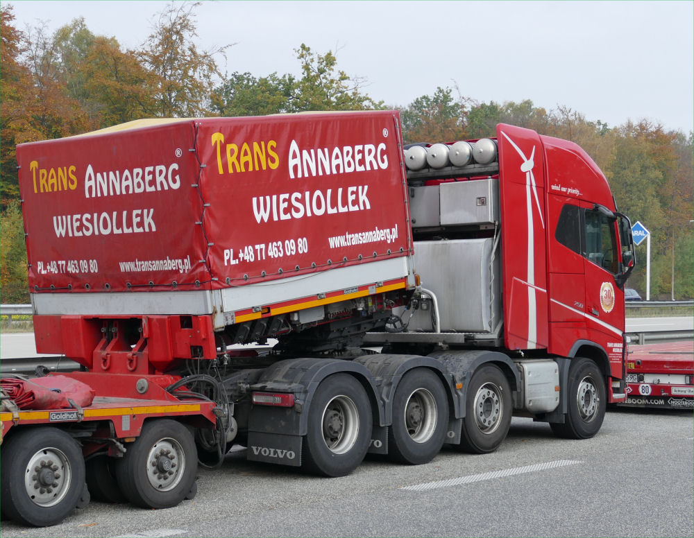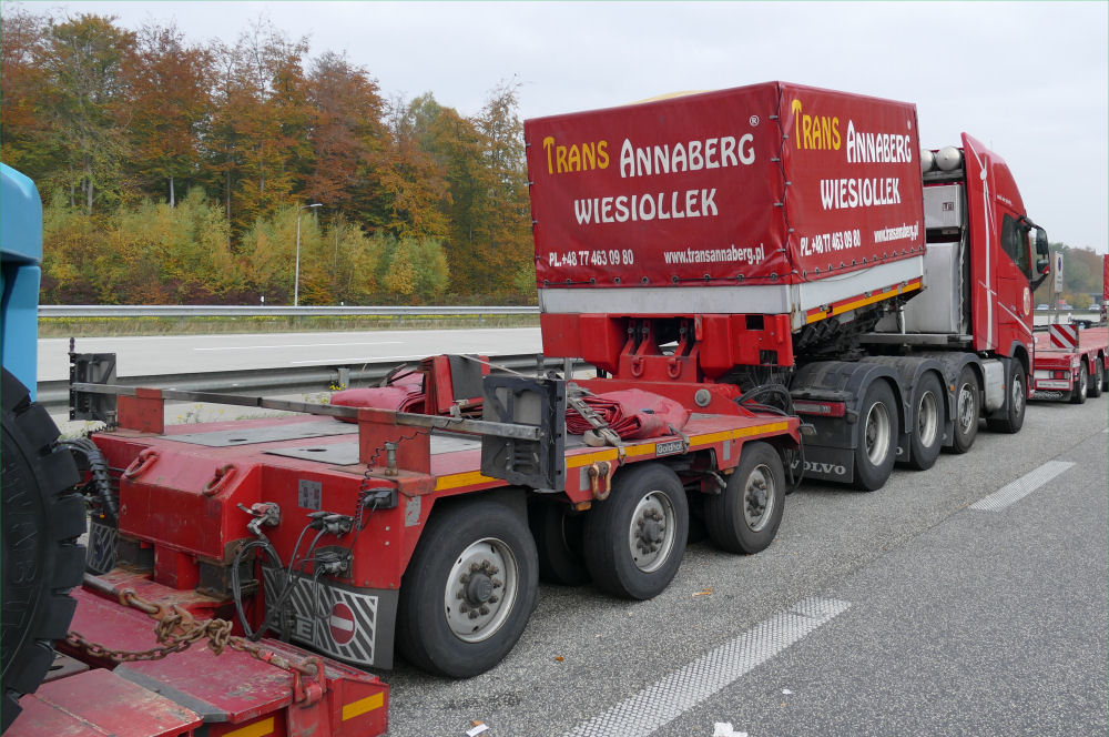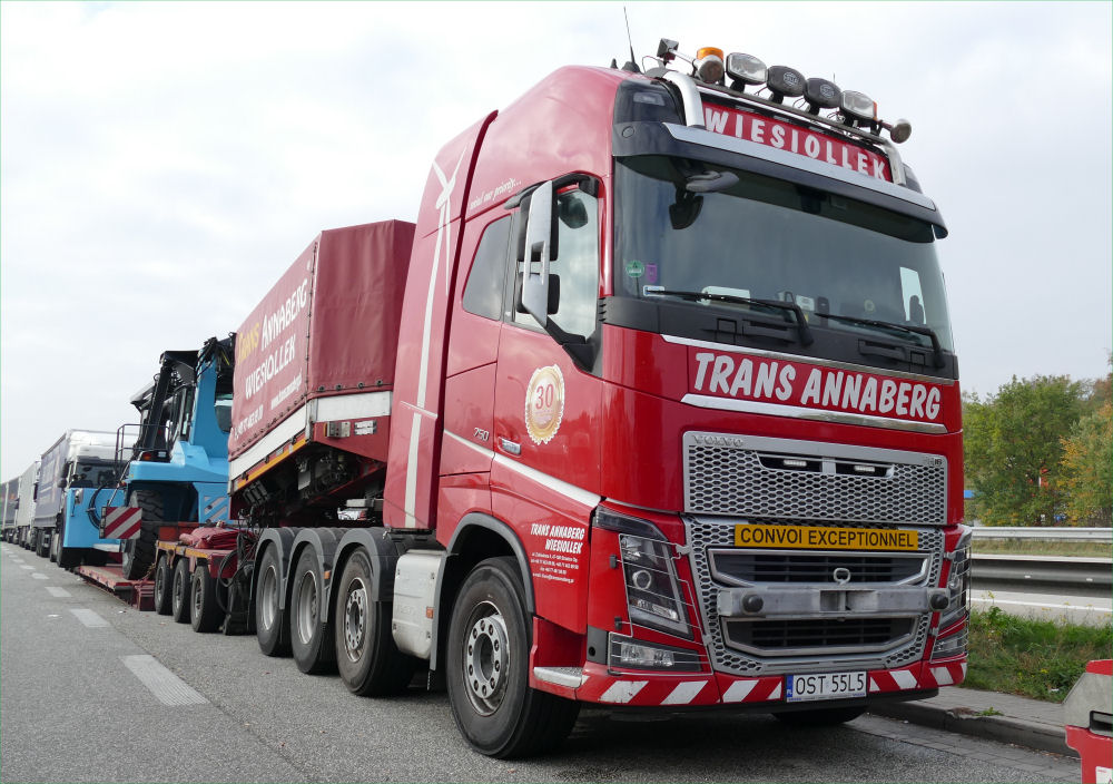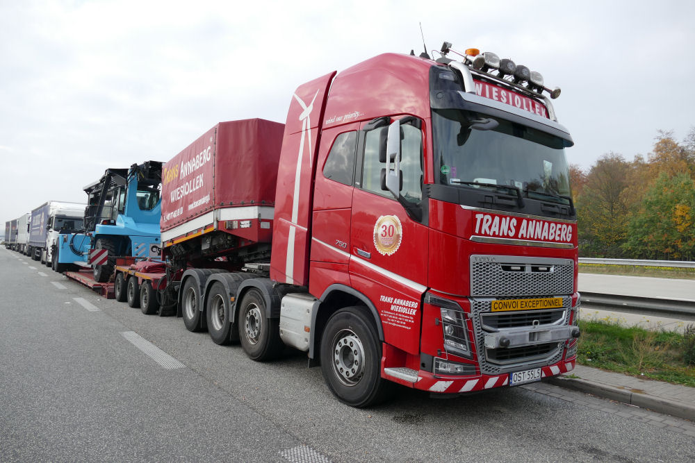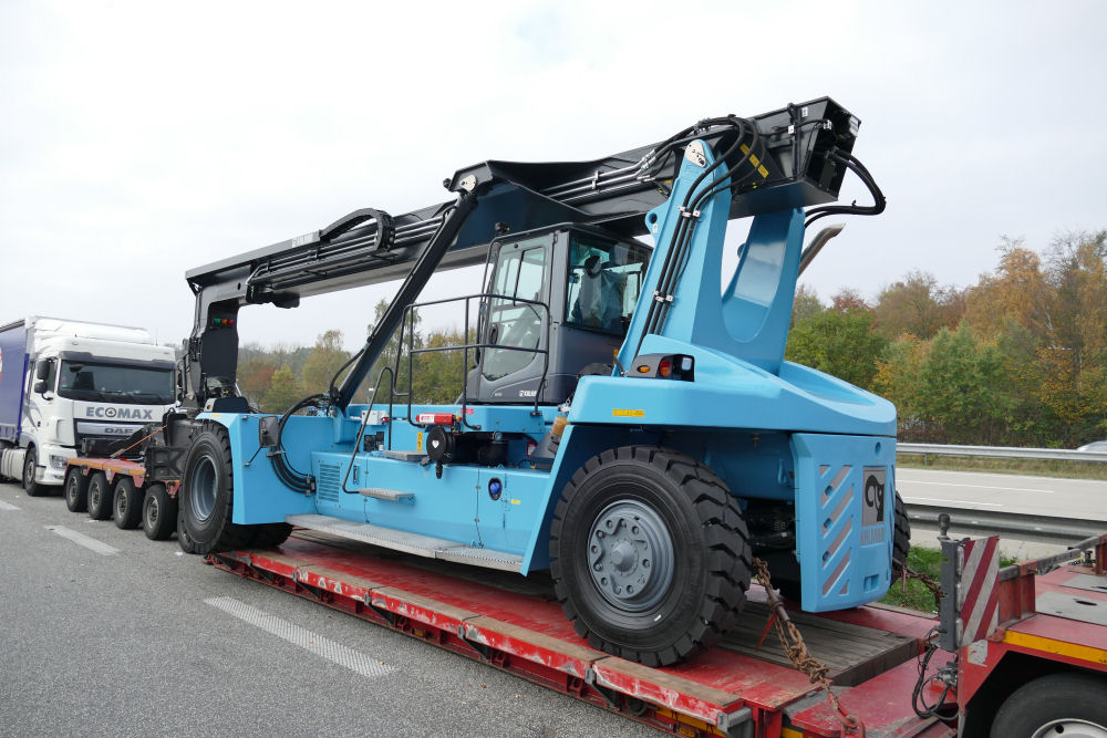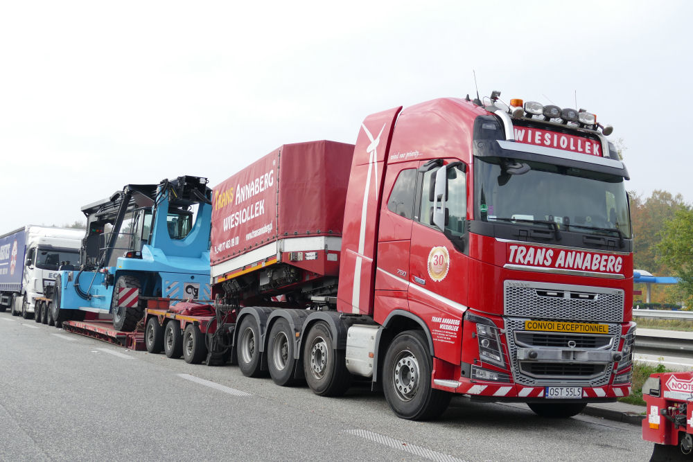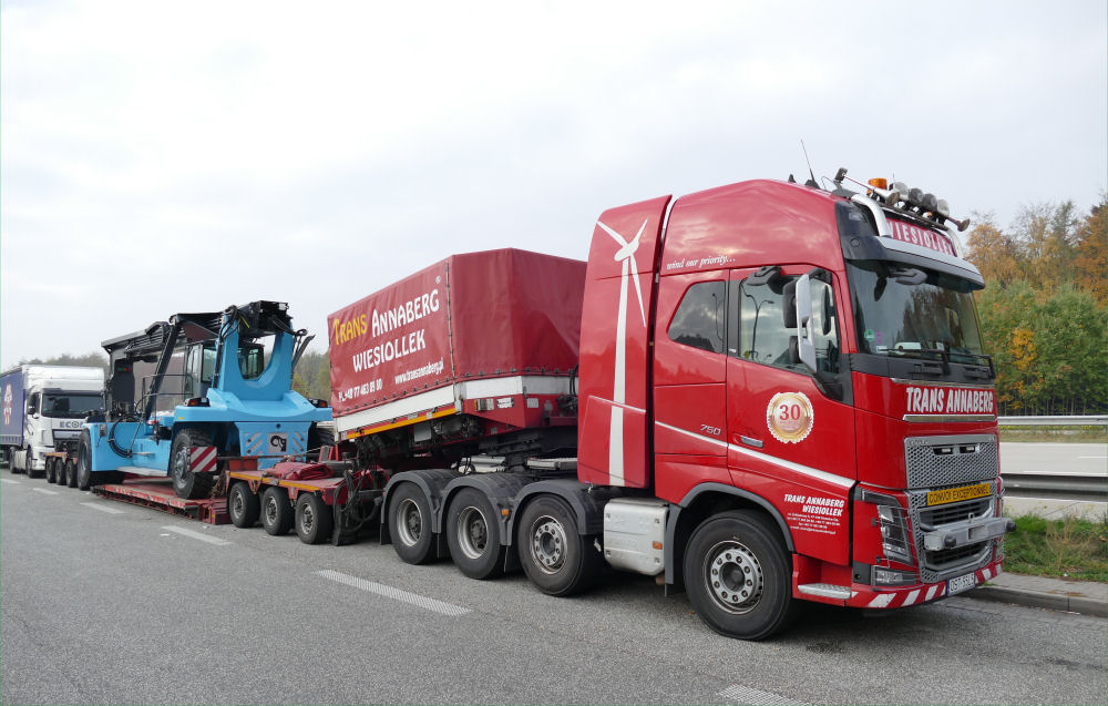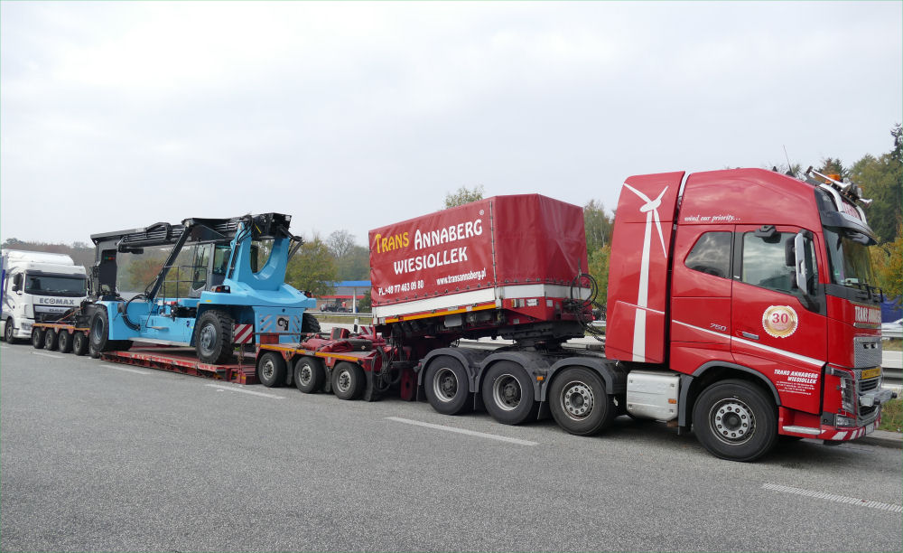 Volvo FH 16 750 8x4 mit Goldhofer 3-5 Tieflader und Kalmar DRG 100 Reachstacker