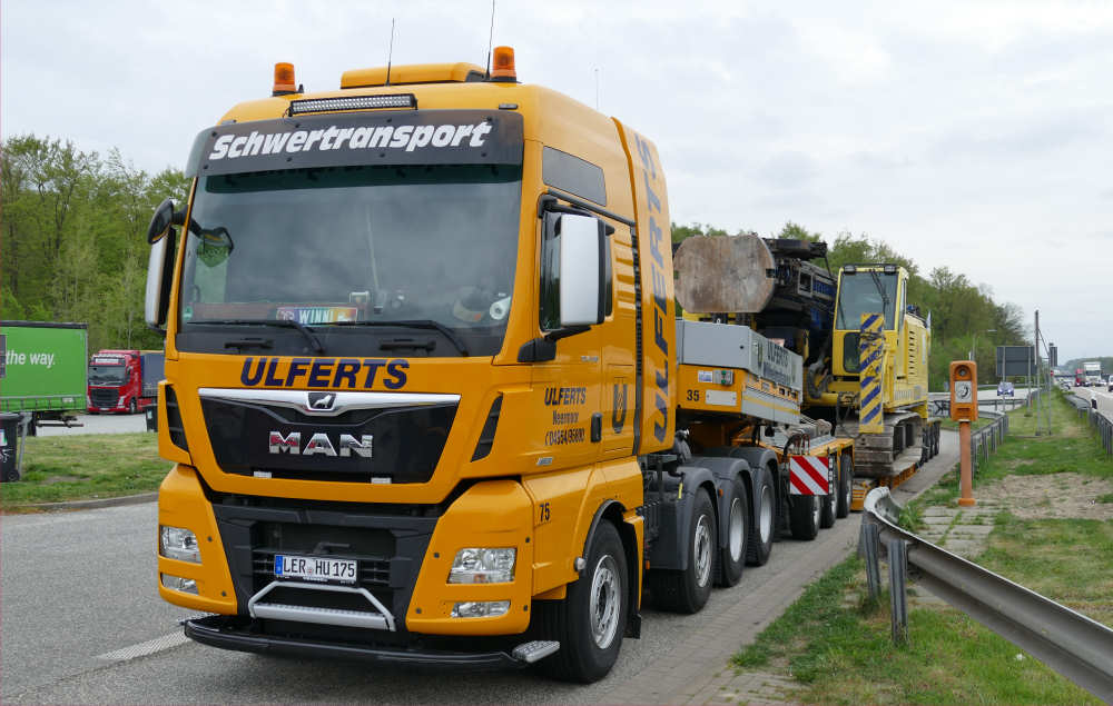 Die Transportkombination bestand aus MAN 41.580 TGX mit Goldhofer 3/5 THP XLE Tieflader.