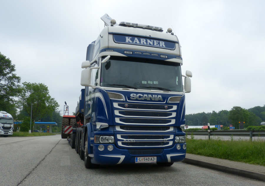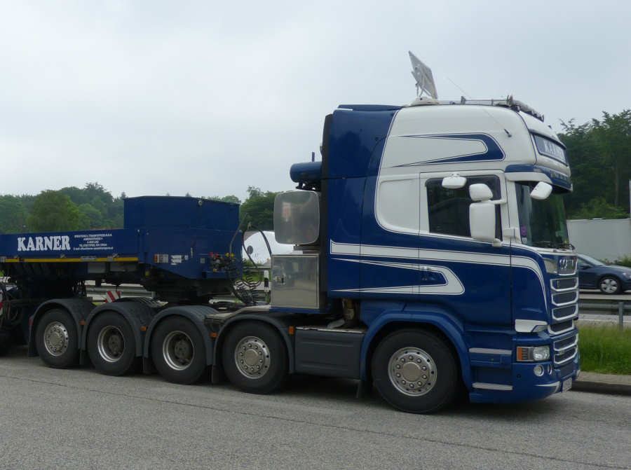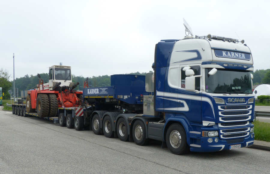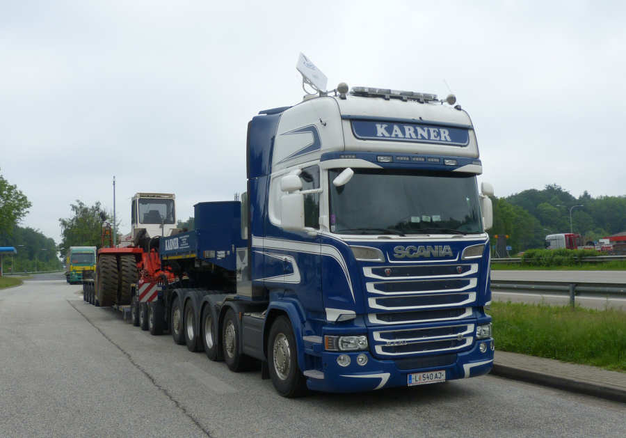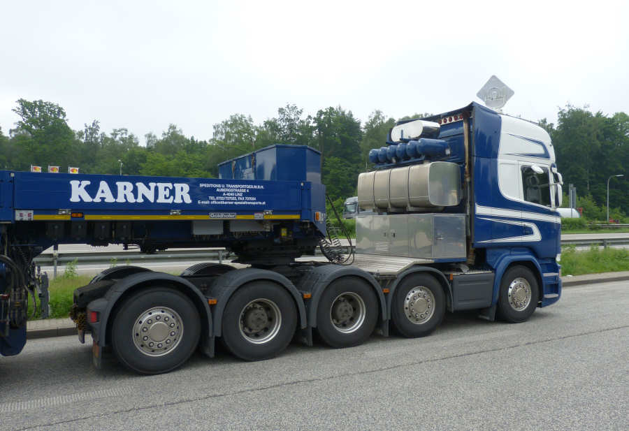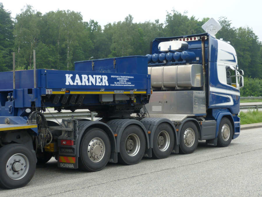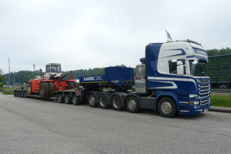 Scania R 730 10x4 mit Goldhofer 3/5 Tieflader und Svetruck Containerstapler