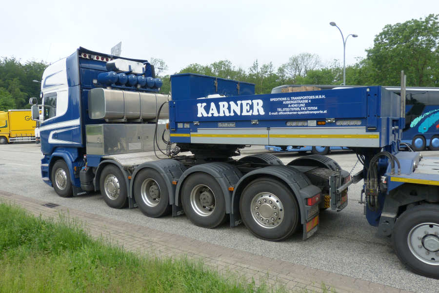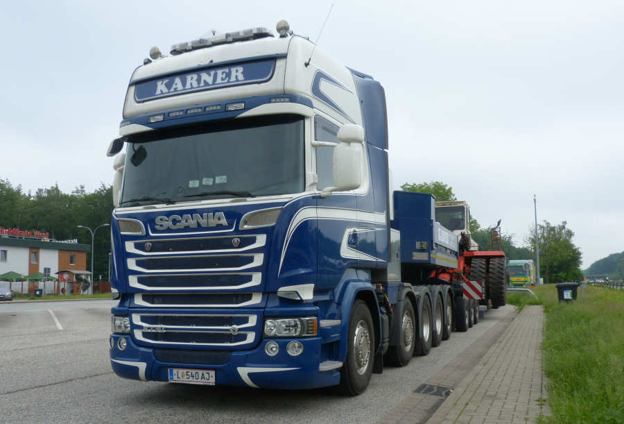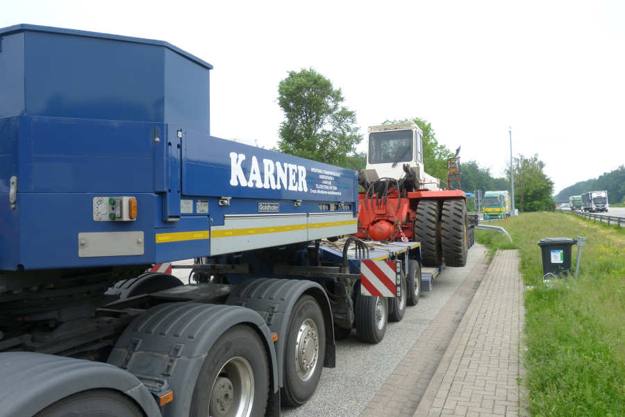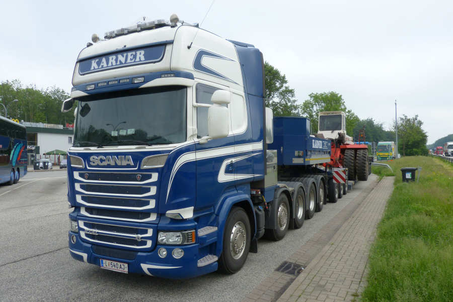 Anfang Juni stand dieser Transport der Spedition Karner aus Österreich, mit einem Svetruck 45120 Containerstapler