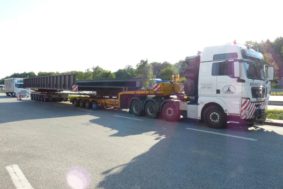 und 7,30 m breit. Die Breite war auch das Problem bei diesem Transport. Bedingt durch zahlreiche Engstellen