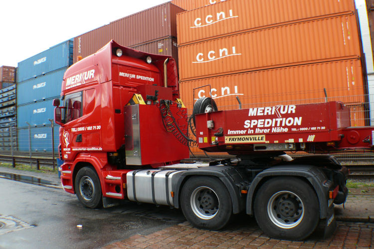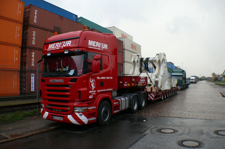 Hier konnte ich einen Transport der Spedition Merkur, beladen mit einem 62,5 t schweren Anlenkstück eines Terex