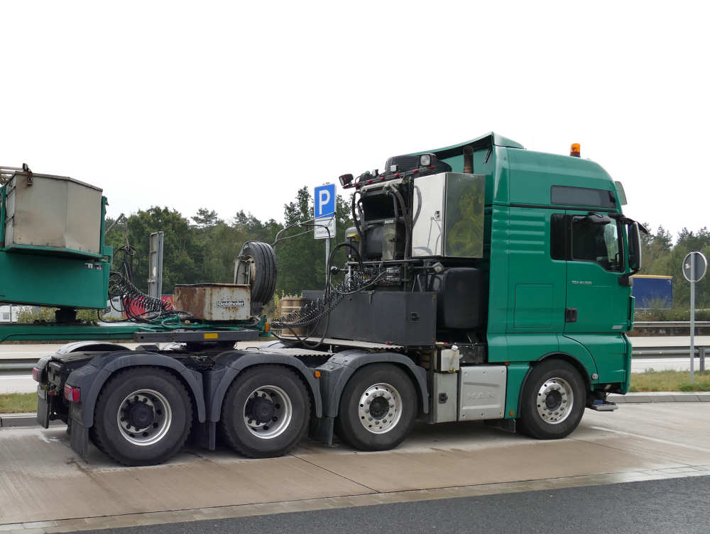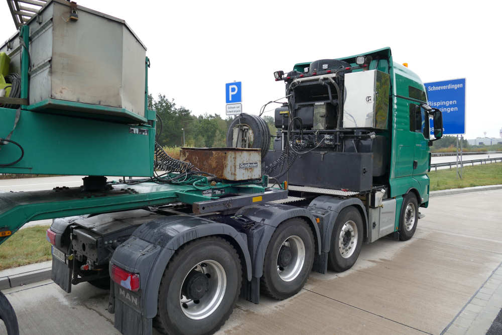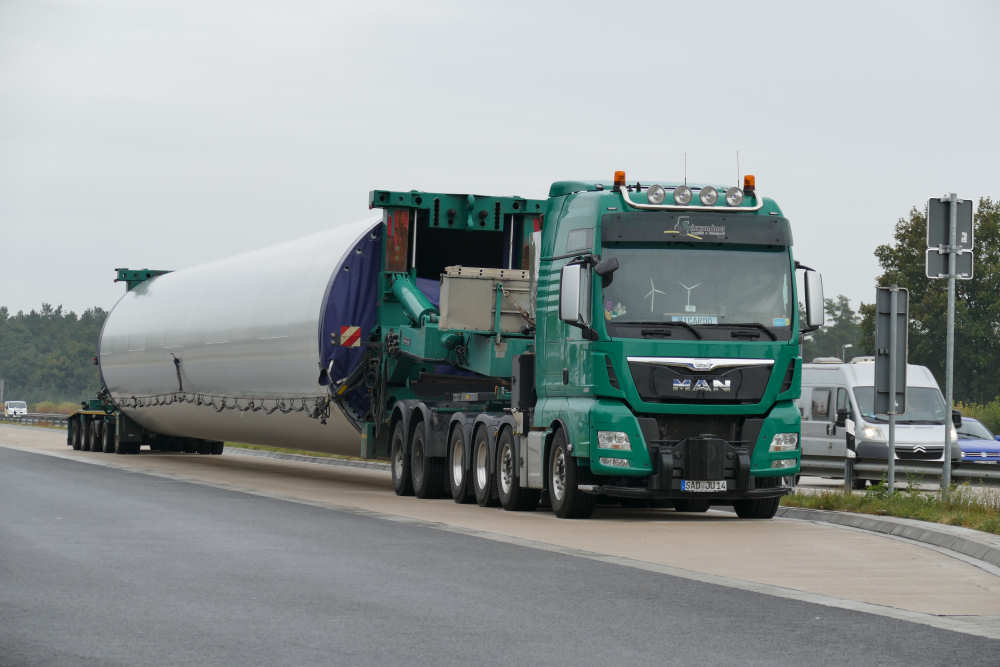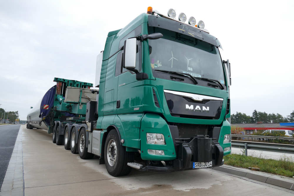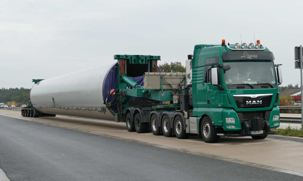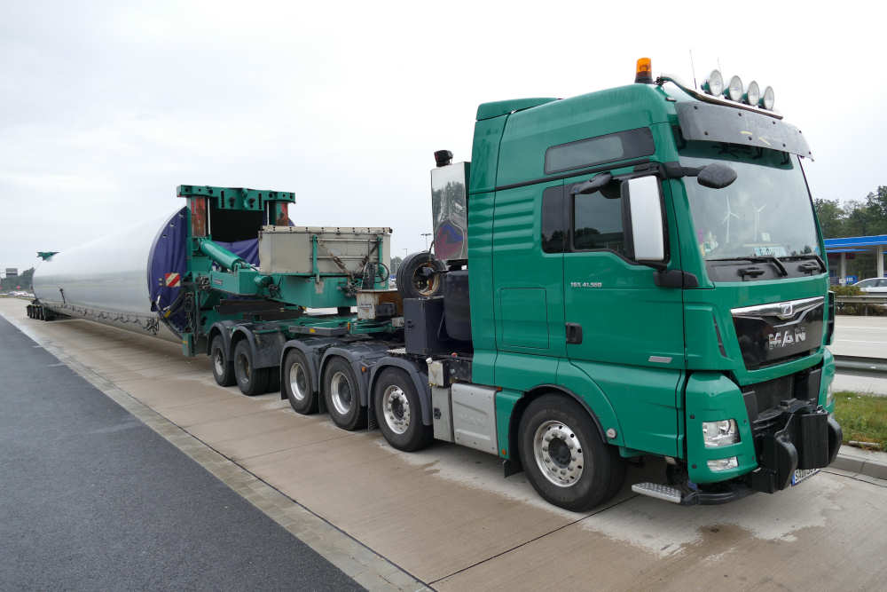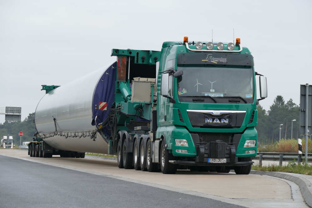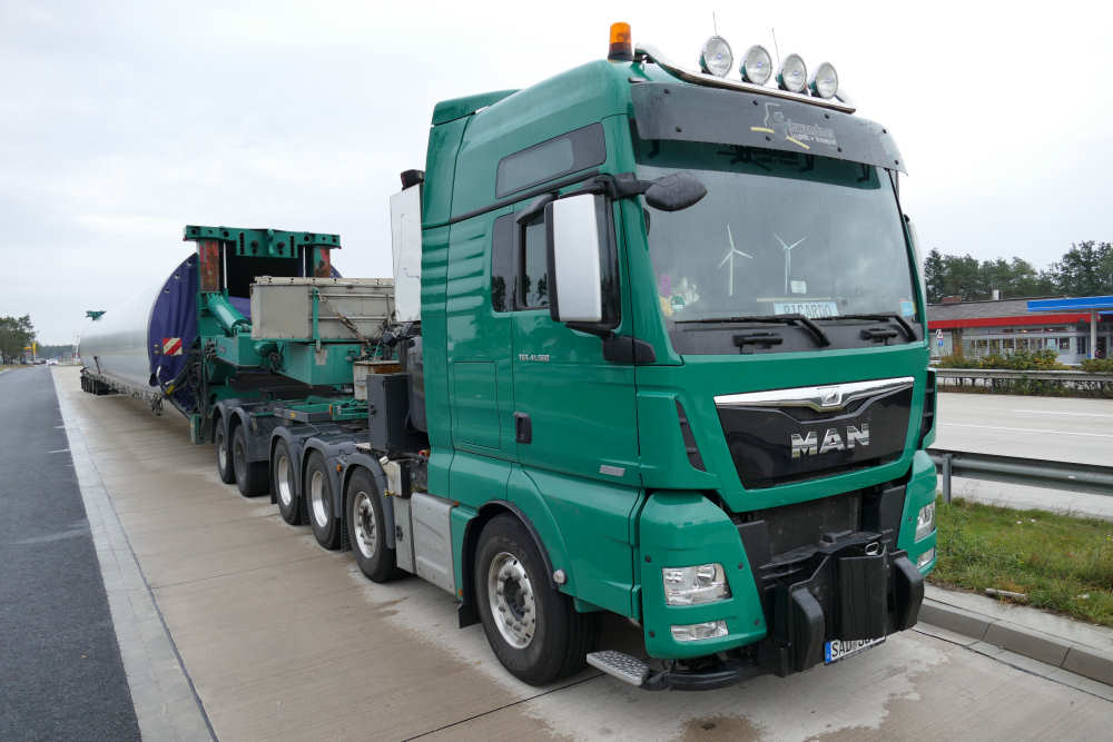 MAN 41.560 TGX mit Goldhofer Rohradapter Kombination und Vestas WEA Turmelement