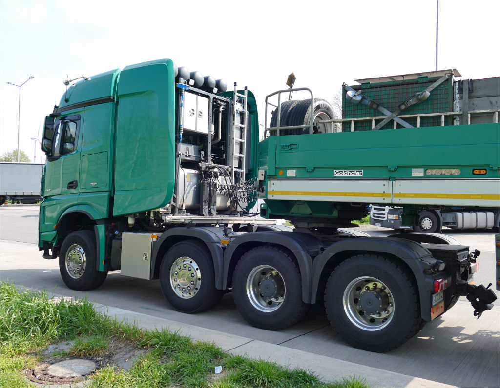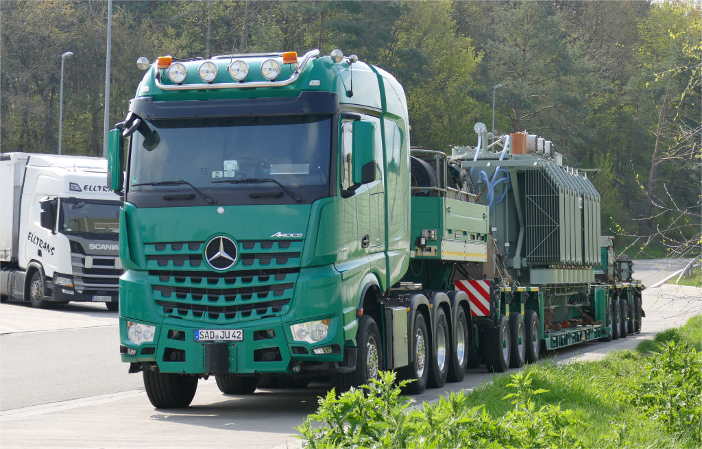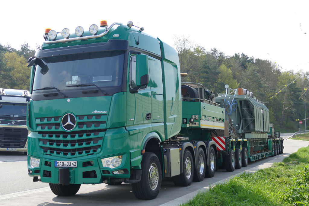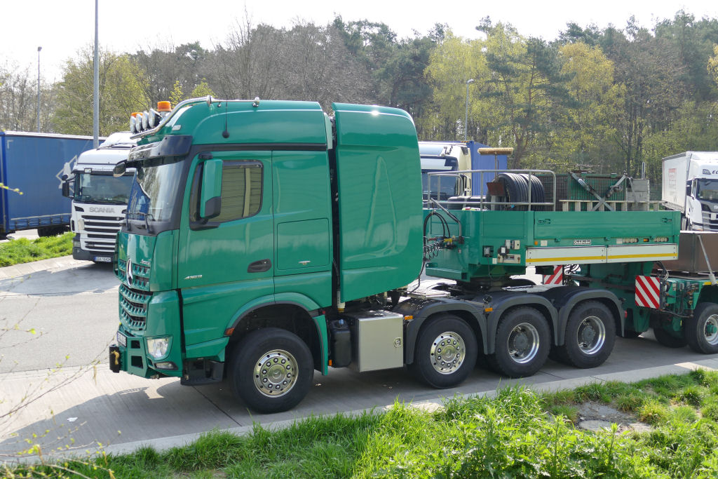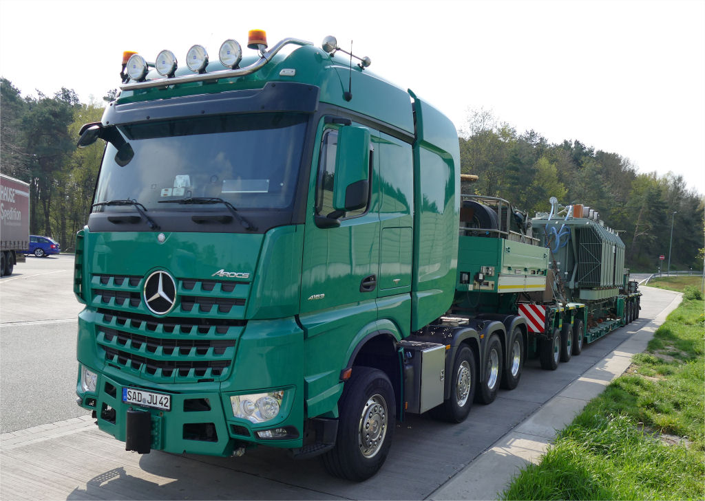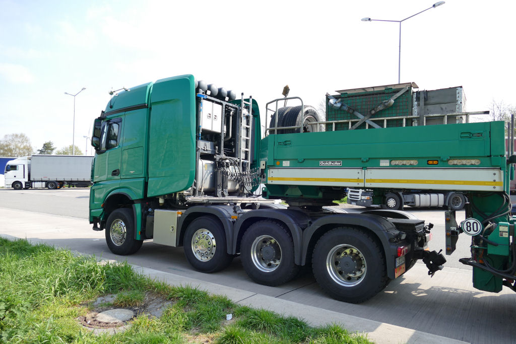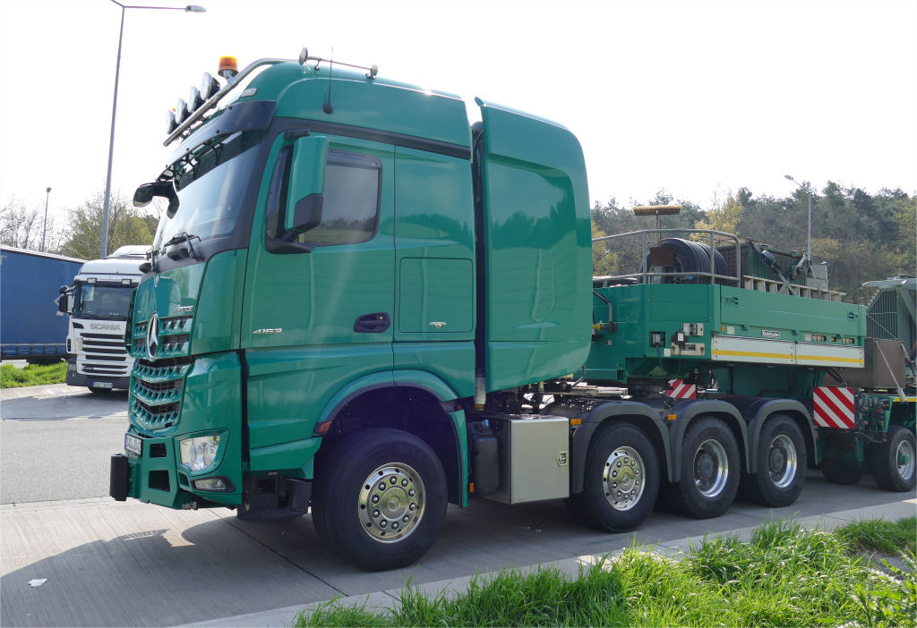 Somit bestand die Schwerlastkombination aus MB 4163 Arocs 8x4 SLT und Goldhofer 3-5 THP ET Sattelroller mit zwischen