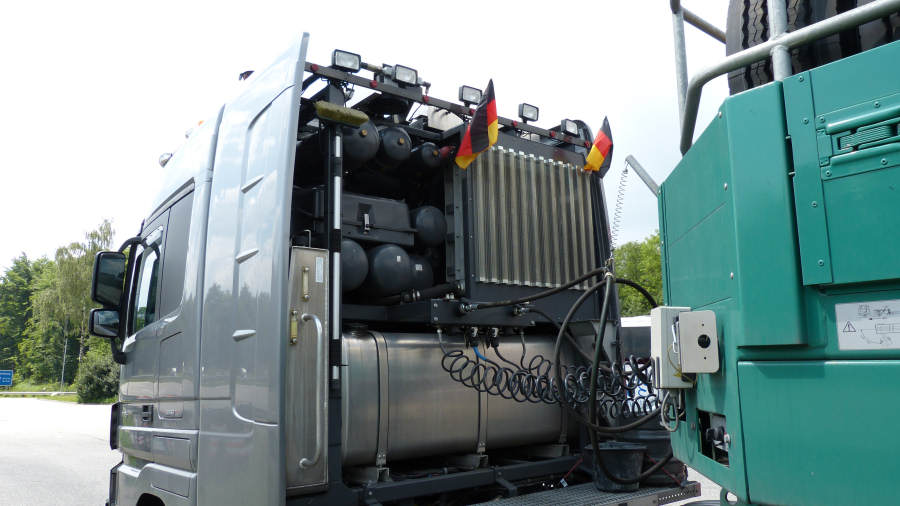 Die Zugmaschine war eine MB 4165 MP 3 mit Goldhofer THP/ET 4/5 Kombination und verlängertem
