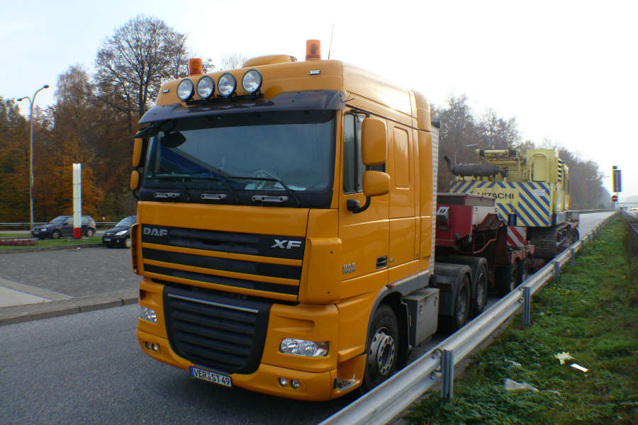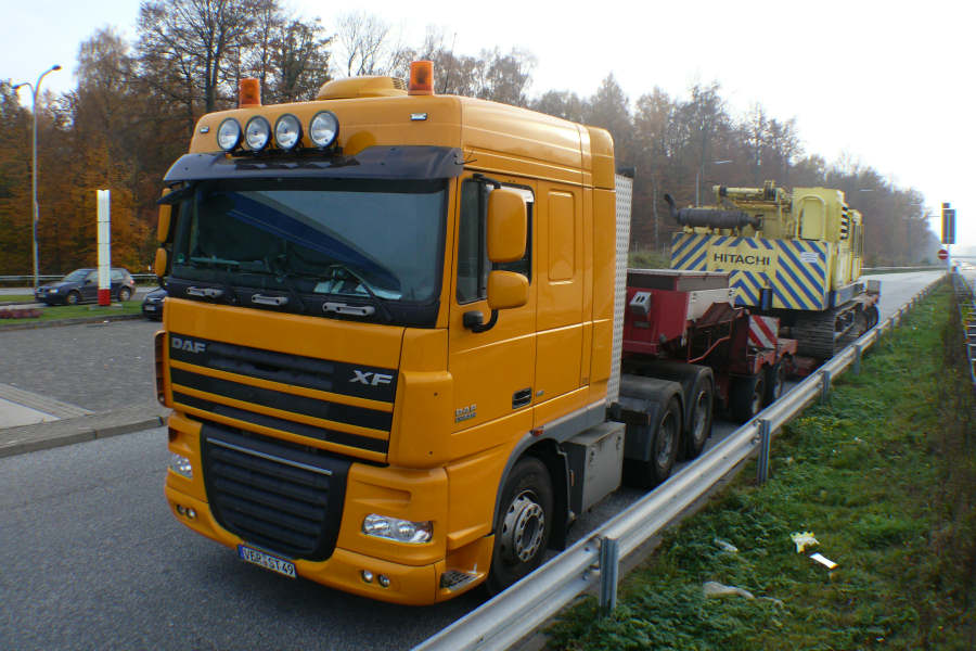 Eine DAF 105.510 XF Dreiachs Zugmaschine mit 2/4 Tieflader transportierte einen Hitachi