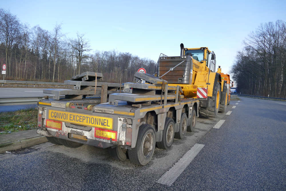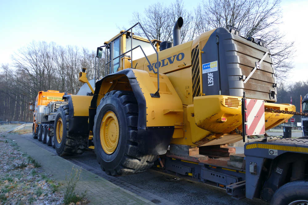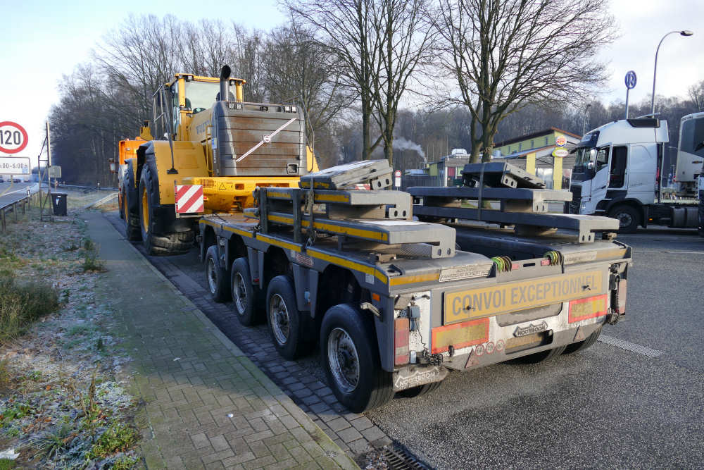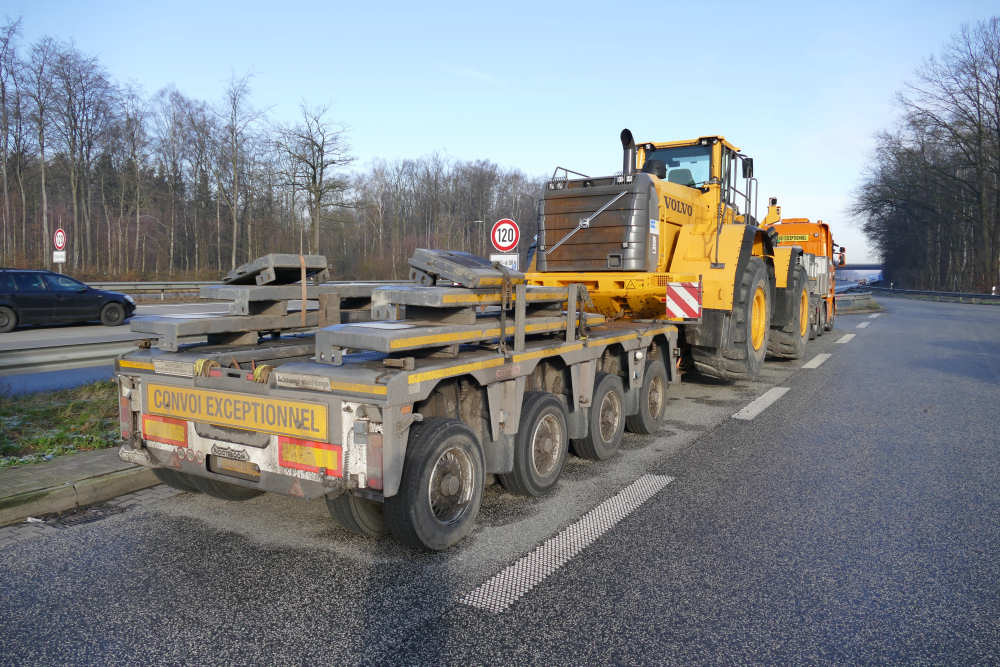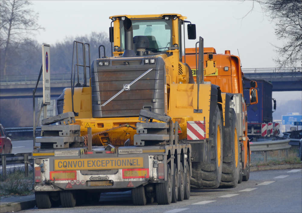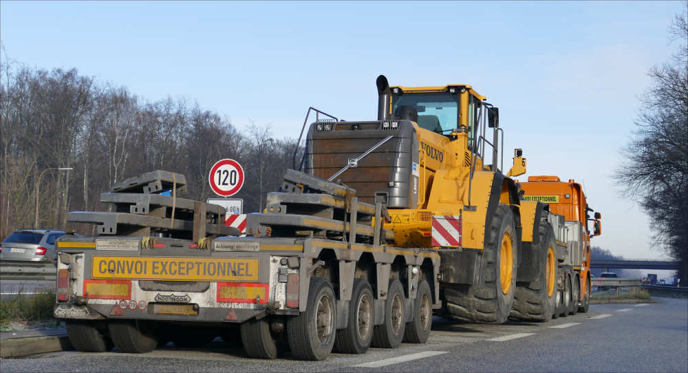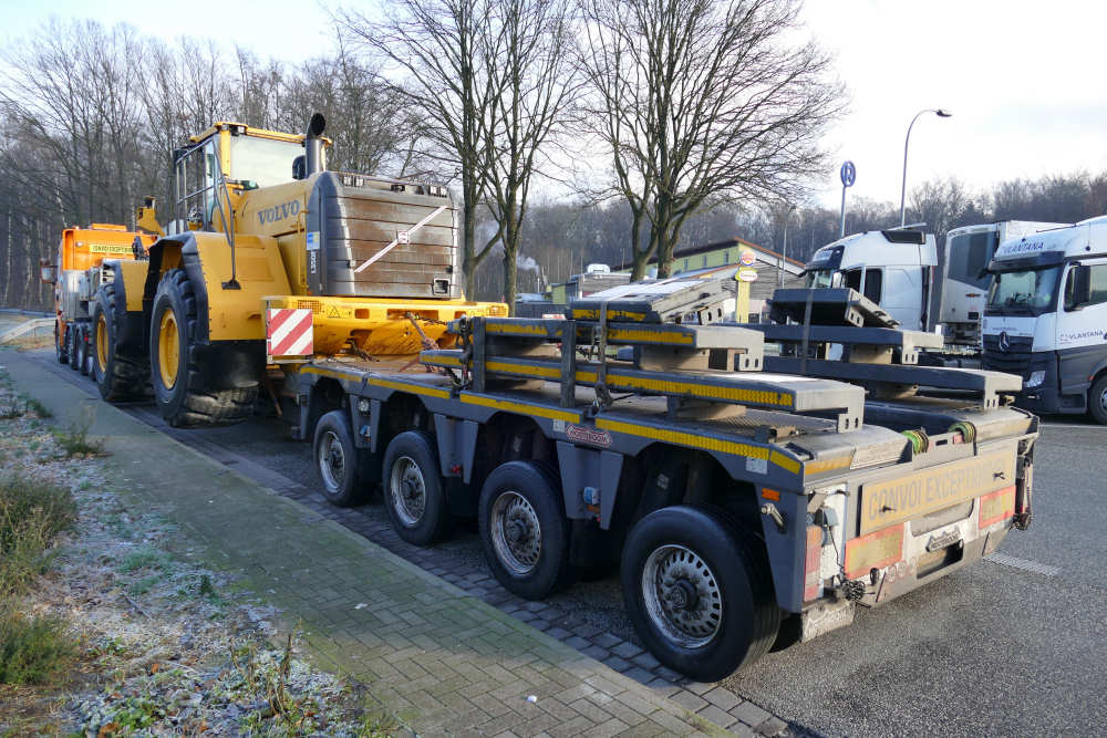 Scania R 490 10x4 mit Nooteboom 4achs Eurotieflader und Volvo 350 LF Radladertransport