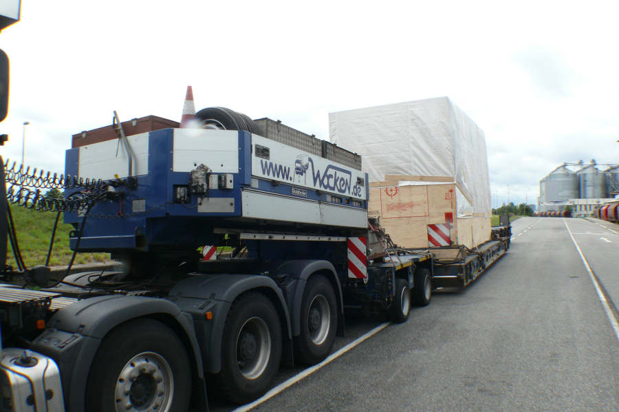 Es wurde eine 42 t schwere Überseekiste für den Export angeliefert.