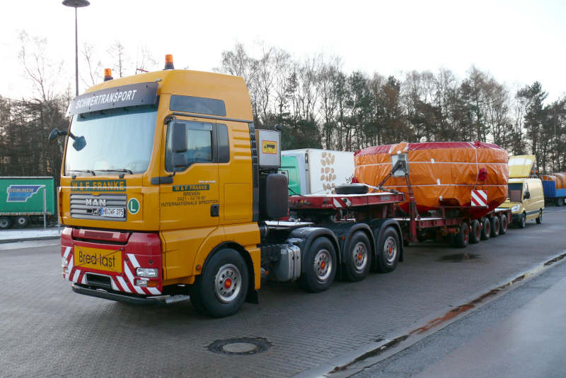 Die Zugmaschine ist eine MAN TGA 41.540, auf dem fünfachsigem Goldhofer Tieflader wurde
