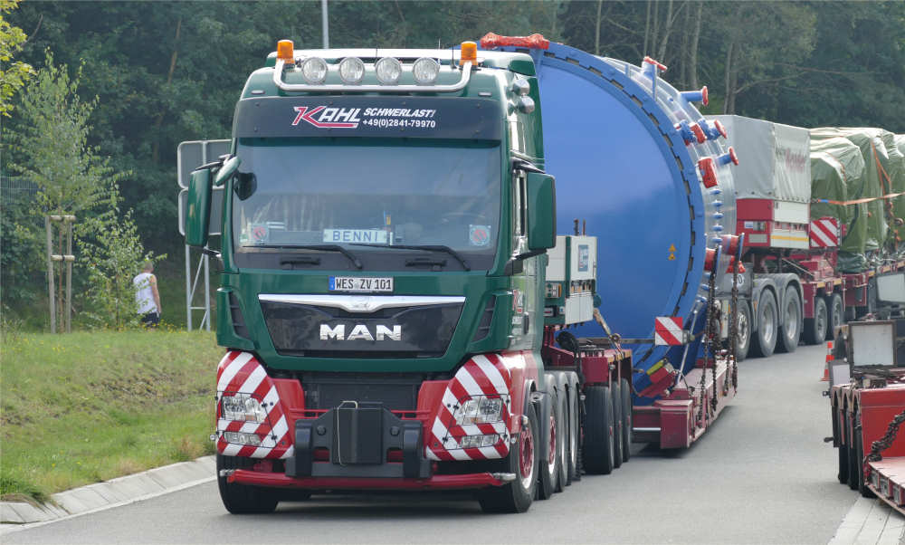 Die Schwerlastkombination bestand aus MAN 41.560 TGX mit Goldhofer THP XLE 3/5 Kesselbetttieflader.
