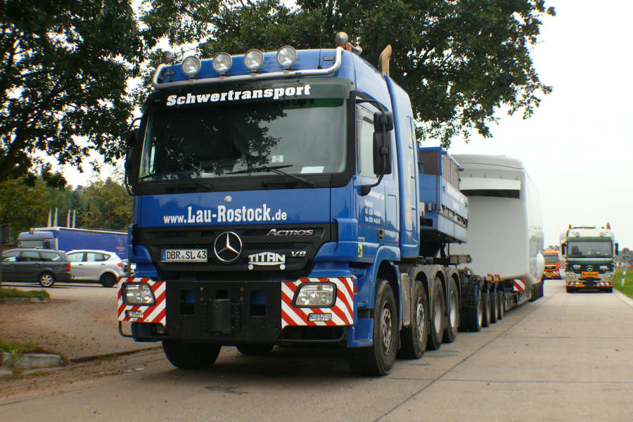 Im September 2011 stand dieser Transport von Lau Schwertransport, aus Rostock, mit einem 80 t GE WEA Generatorenhaus