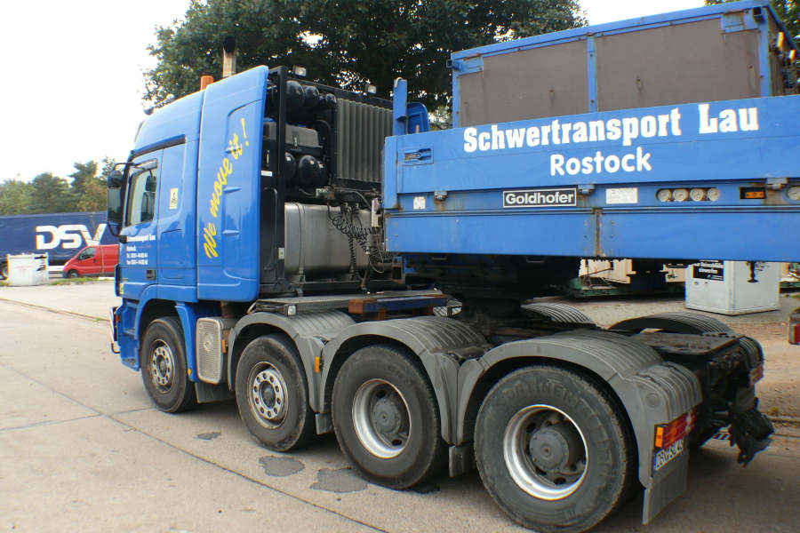 Die Zugmaschine war eine MB 4160 MP 2 Titan, aufgesattelt eineGoldhofer THP Kesselbett Kombination.