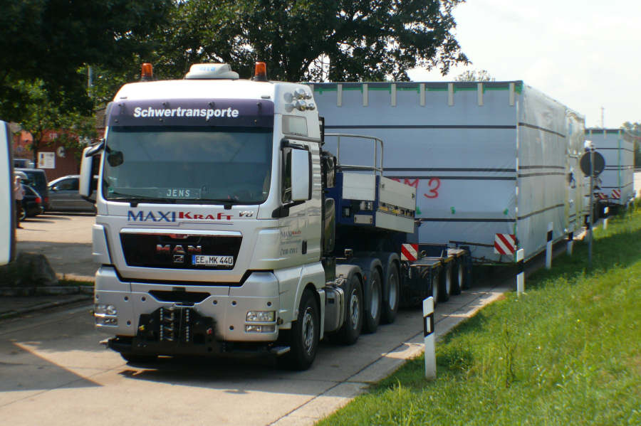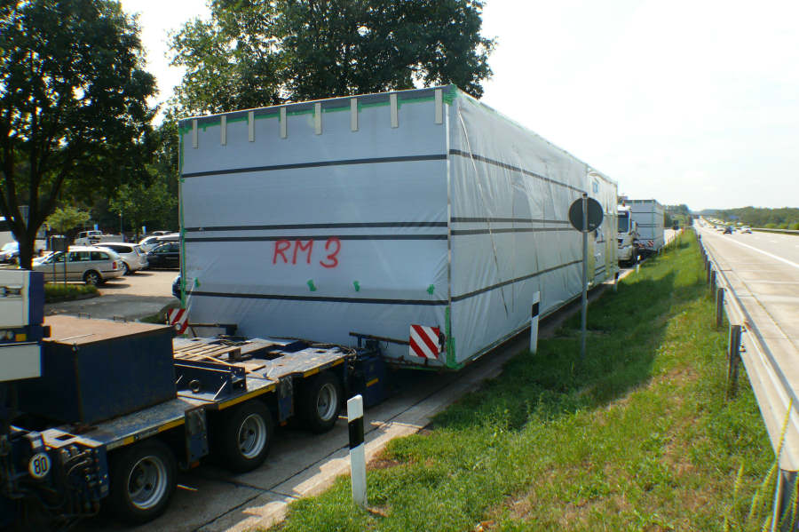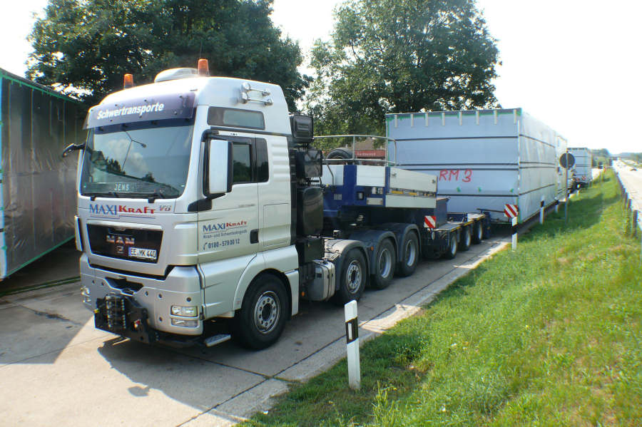Im Juni 2011 standen zwei Transporte der Firma Maxikraft auf der Raststätte Brunautal, beladen mit Raumzellen