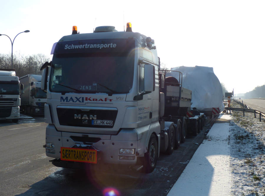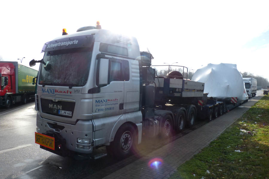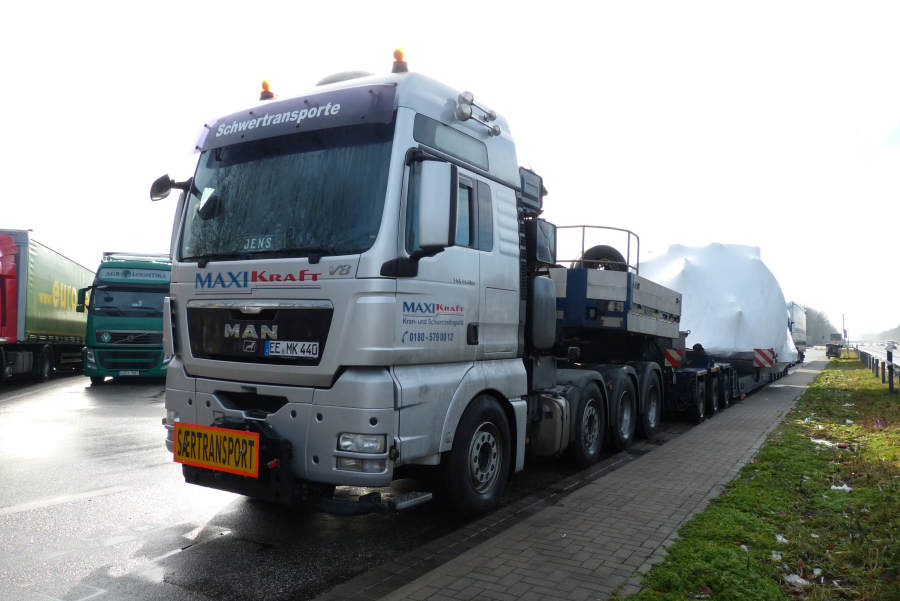 Im Januar 2014 stand Maxikraft mehrfach mit Enercon E-101 Gondeln auf dem Rasthof Buddikate Ost.