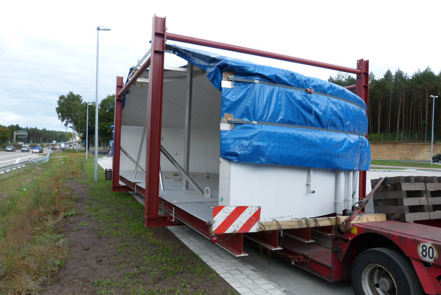 mit zweiachsigem Doll Tiefbett, hatten je eine Hälfte eines Behälters, welcher für den Export