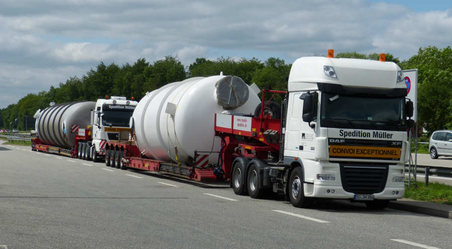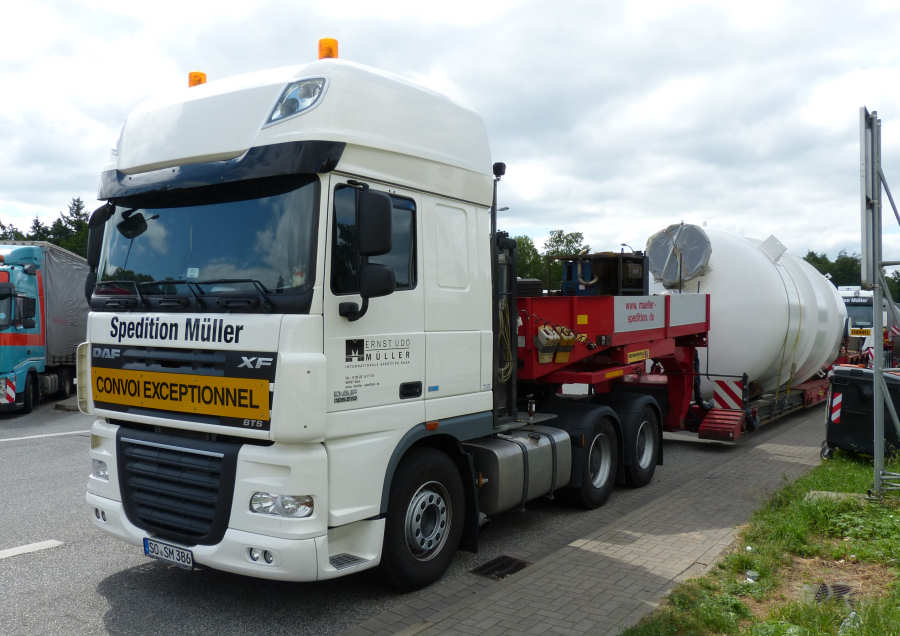 Der erste Transport bestand aus DAF XF 105.510 6x4 Zugmaschine mit vierachs Faymonville Kesselbett.