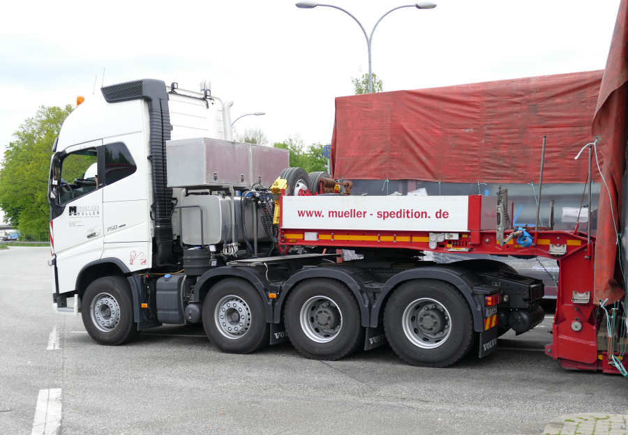 Die Kombinationen bestanden aus Volvo FH 16 750 Euro 6 8x4 und MAN 41.540 TGX 8x4, jeweils mit Faymonville 3 achs Tieflader.