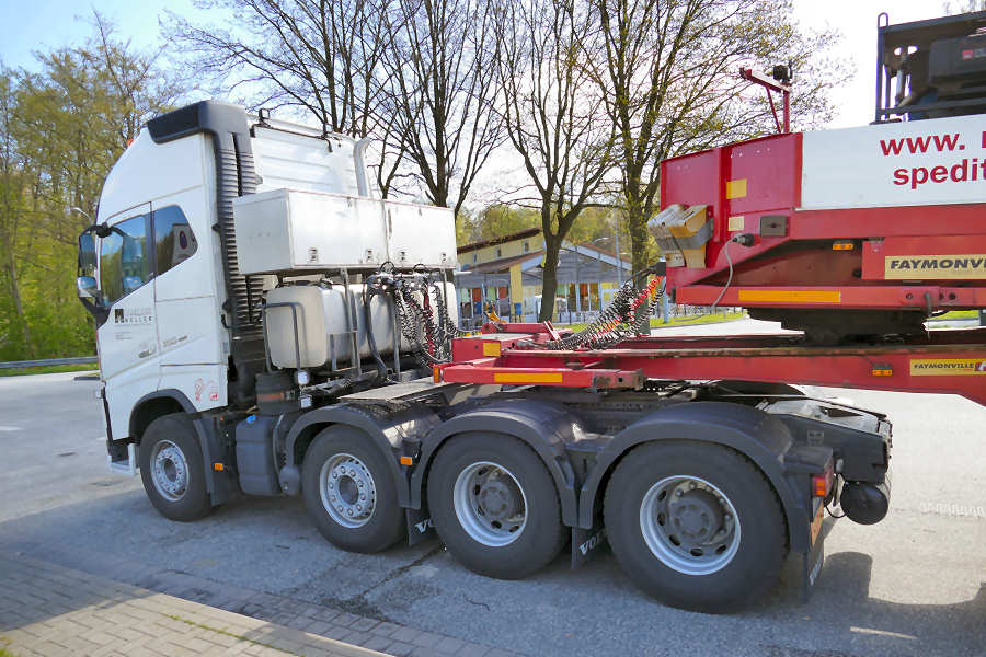 Die Transportkombination bestand aus Volvo FH 16 750 Euro 6 8x4 Zugmaschine und zweiachs Jeepdolly und verlängertem