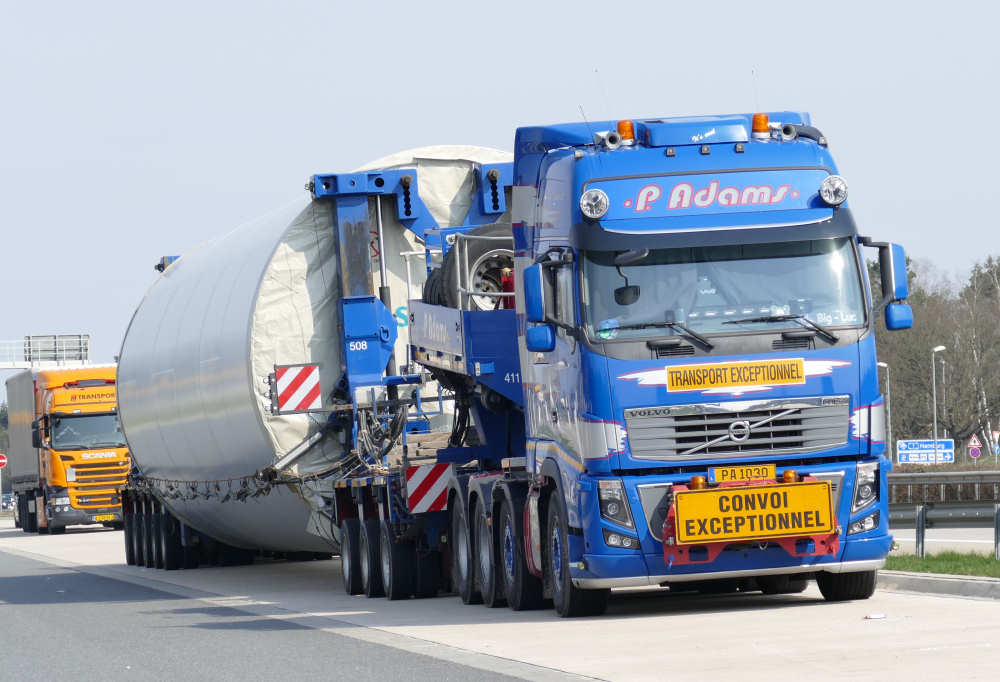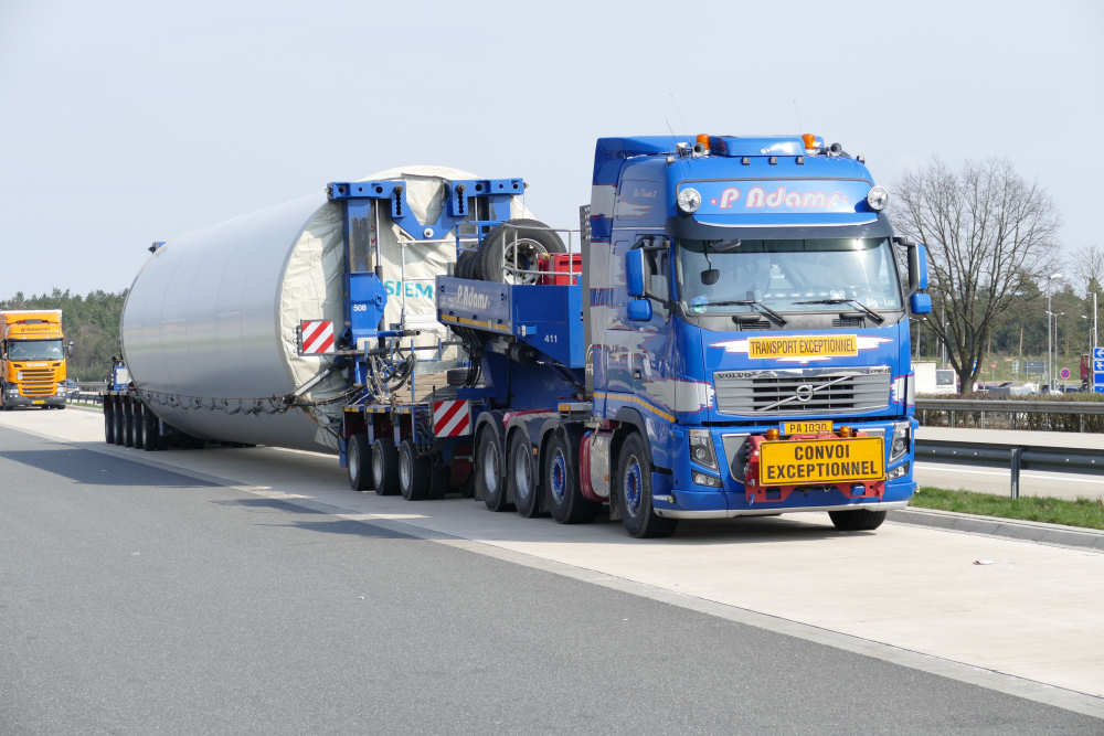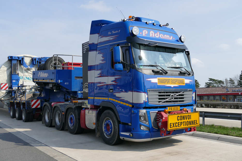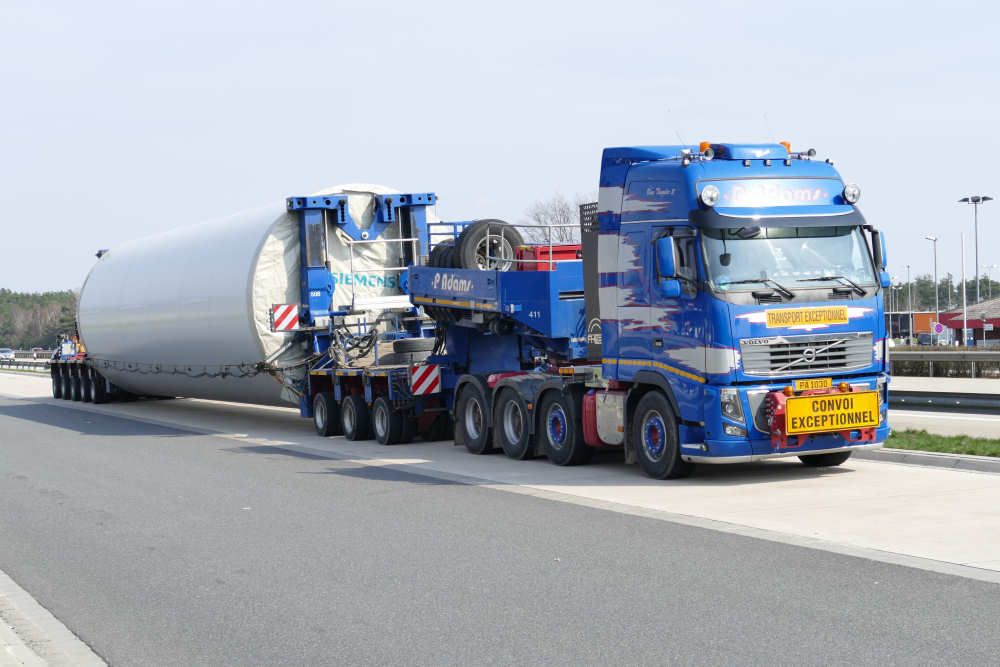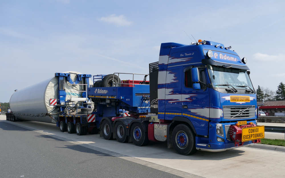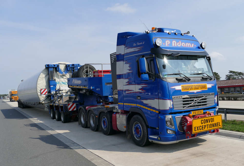 Vovo FH 16 8x4 "Blue Thunder II" mit Goldhofer 3/5 Rohradapterkombination und Siemens WEA Sektion