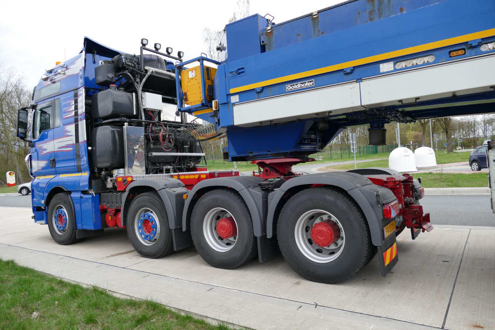 aufgesattelt war eine Goldhofer THP ST 4/6 Rohradapterkombination.