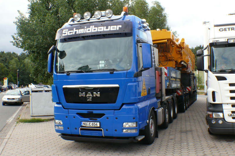 Die Zugmaschine ist eine MAN 41.540 TGX mit einem zehnachsigen Goldhofer THP Sattelroller.