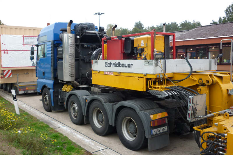 Die Zugmaschine ist eine MAN 41.660 TGA XXL, bei der Tieflade Kombination