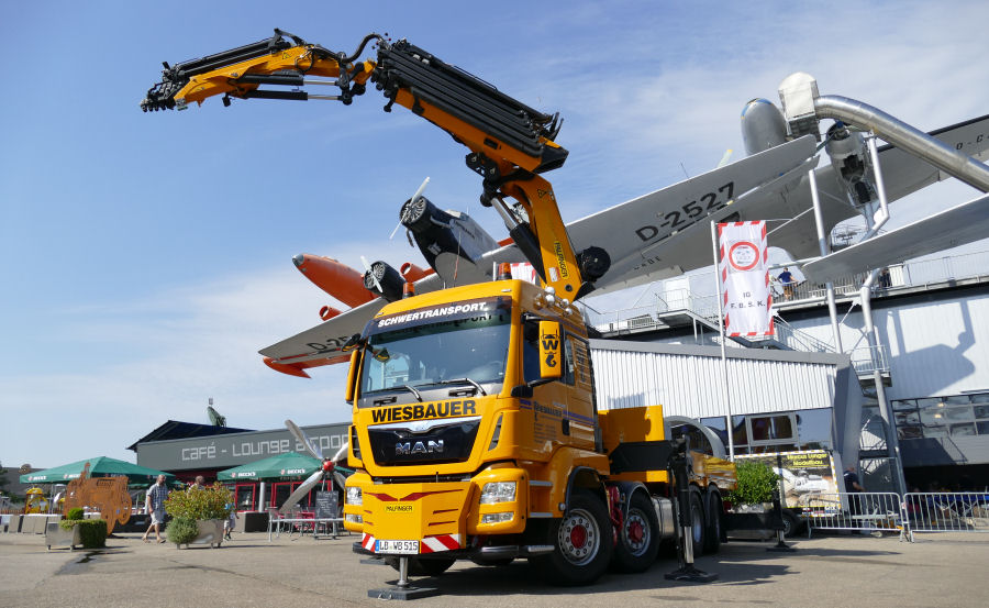 Der Ladekran ist mit einem zweiten (abnehmbaren) Knickarm der sogenannten Fly-Jib ausgerüstet.