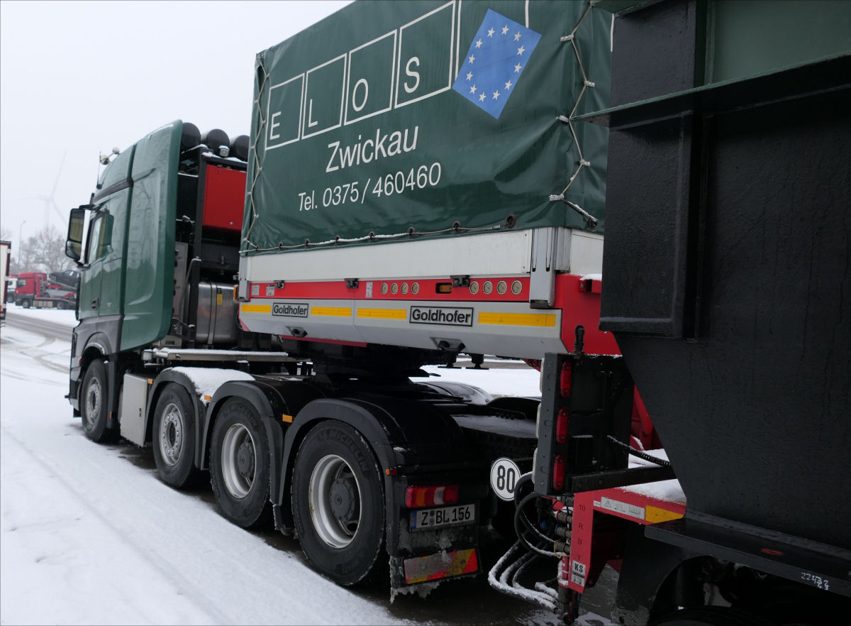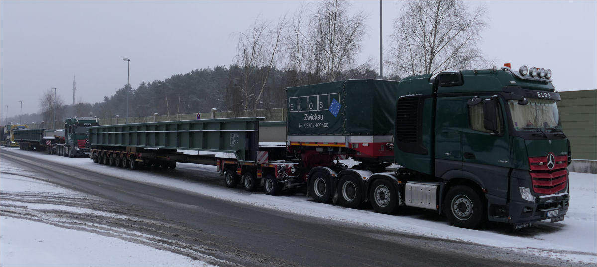 Ebenso die Transportefümit den Geländern, beide jeweils MB 3358 Arocs mit Goldhofer 4 achs Teletrailer.