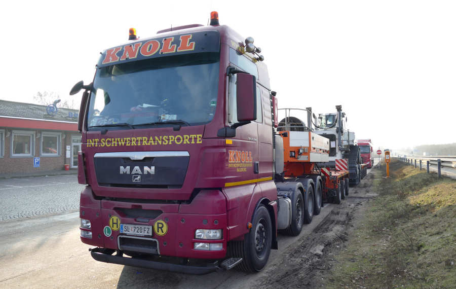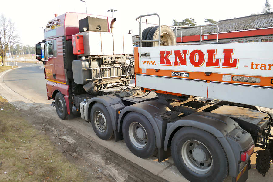Zum Einsatz kam eine Kombination aus MAN 41.540 TGX 8x4 mit Goldhofer THP 3achs Scheuerle Kamag K 25