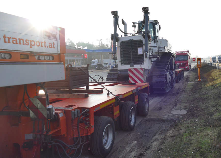 Anbauteile transportiert werden. Auch so bringt das Gerät, 53,5 t auf die Waage, bleibt aber in den Abmessungen