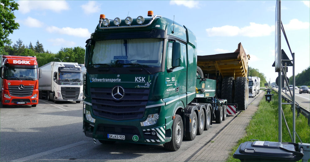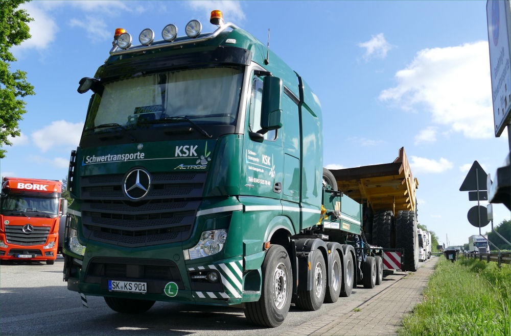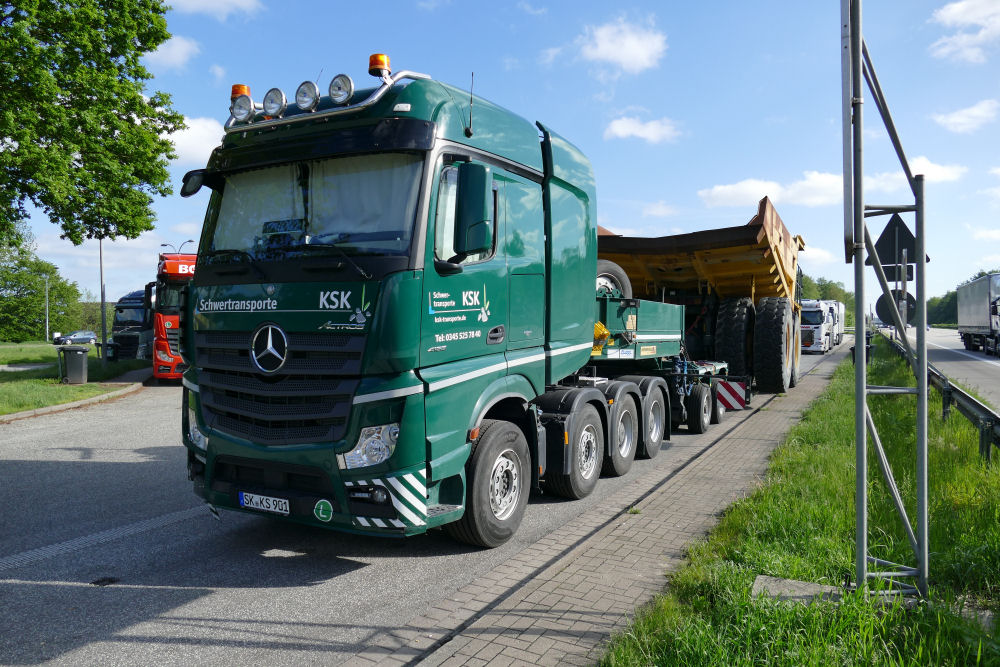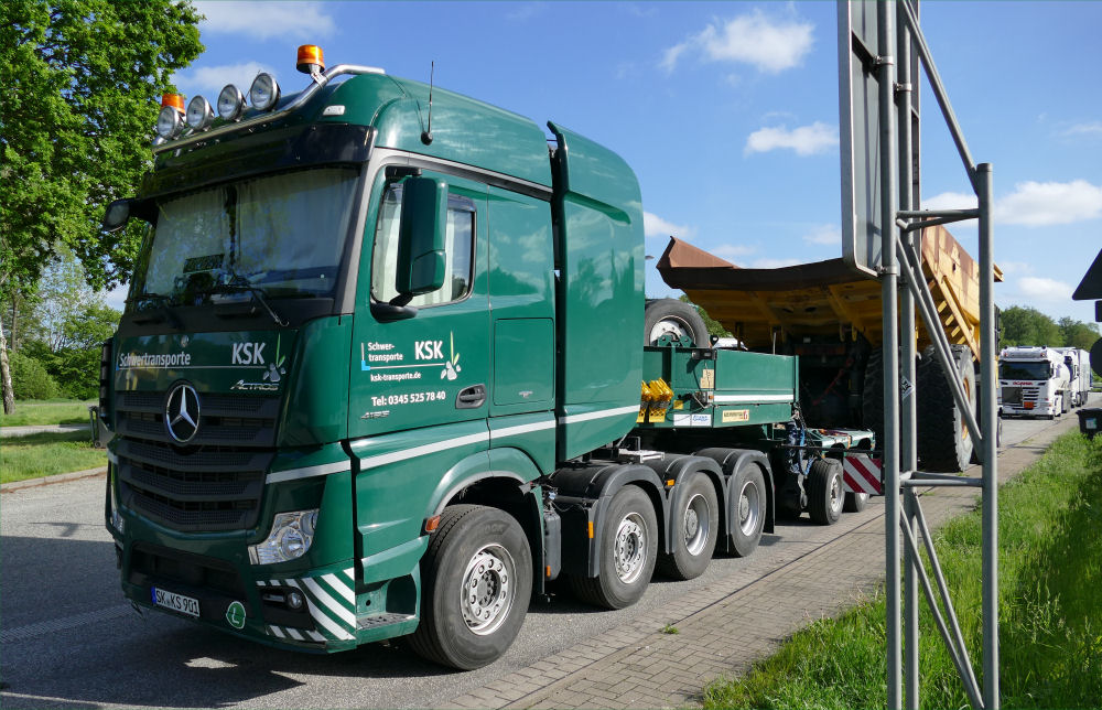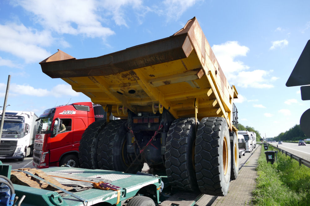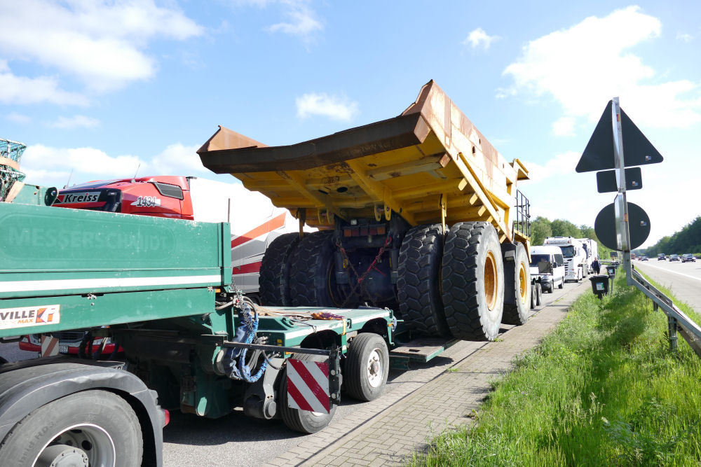 Ende Mai 2019 stand dieser Transport von KSK Schwertransporte mit einem Komatsu HD 605 Muldenkipper
