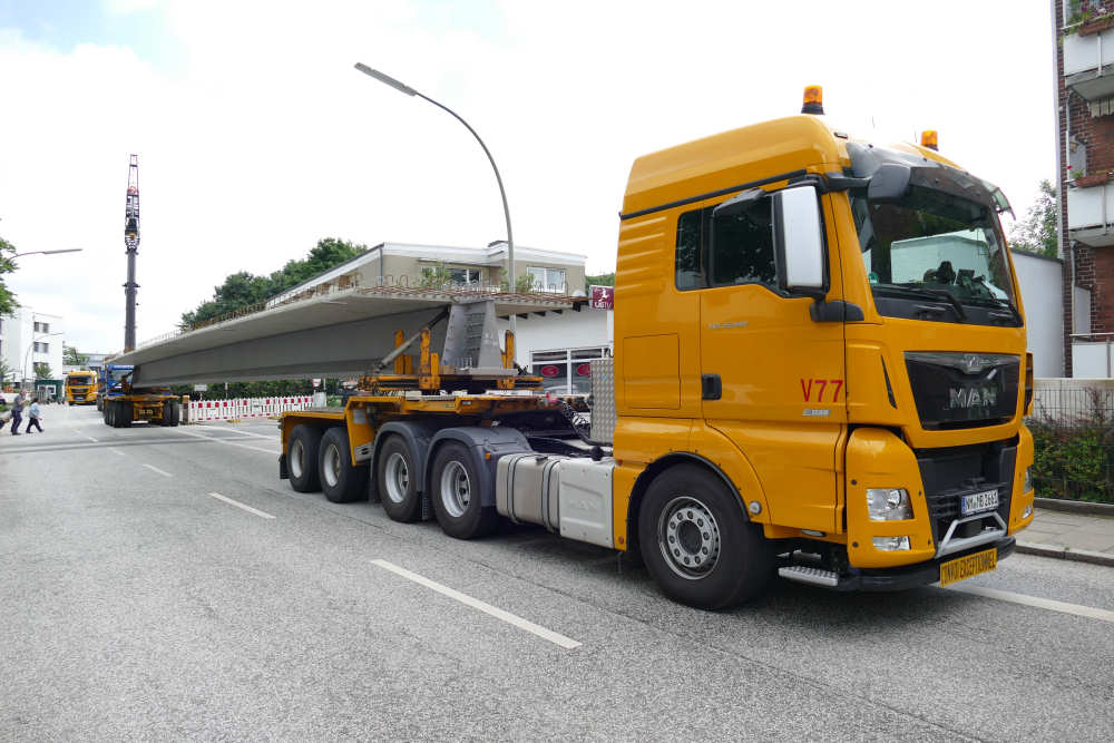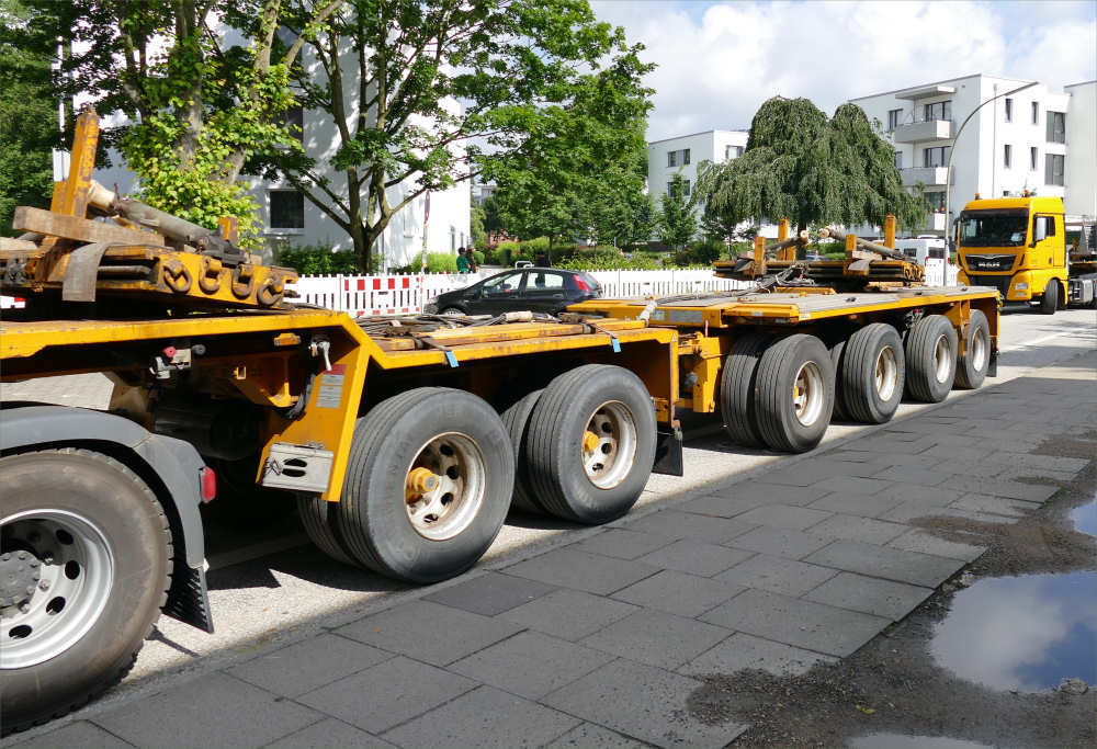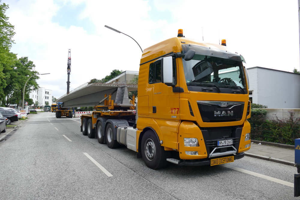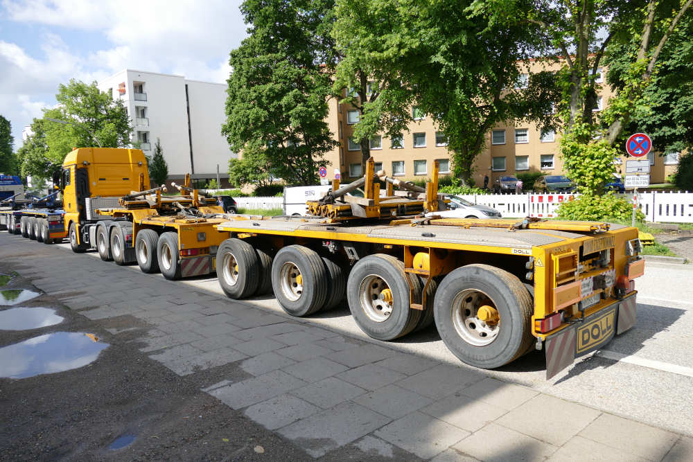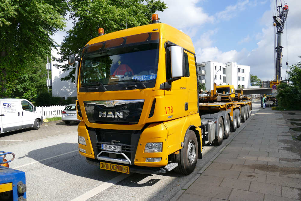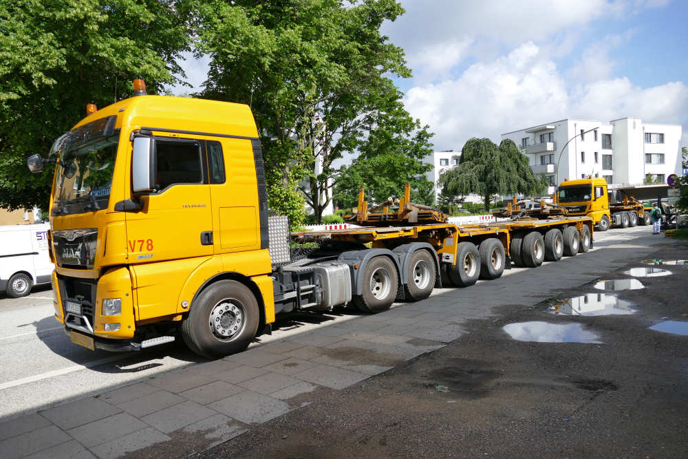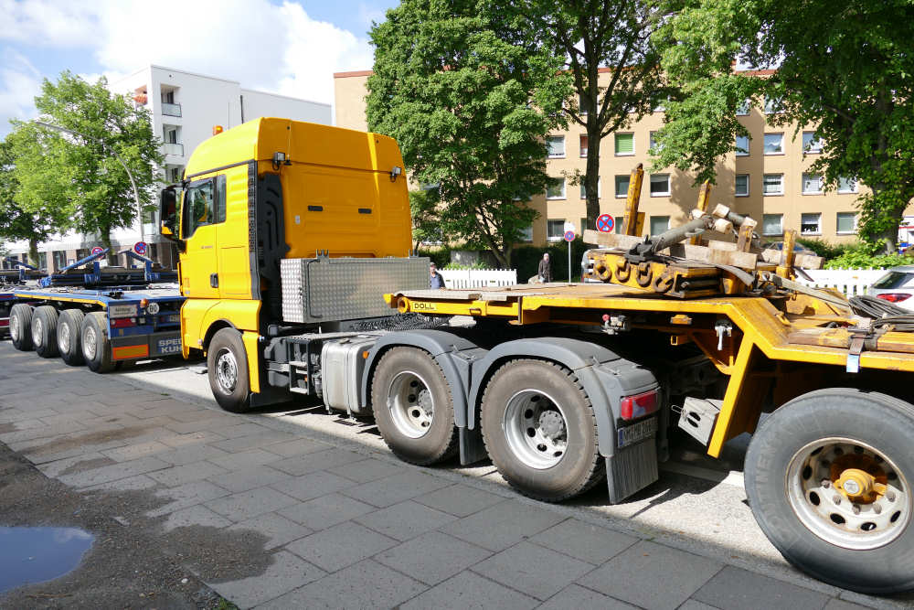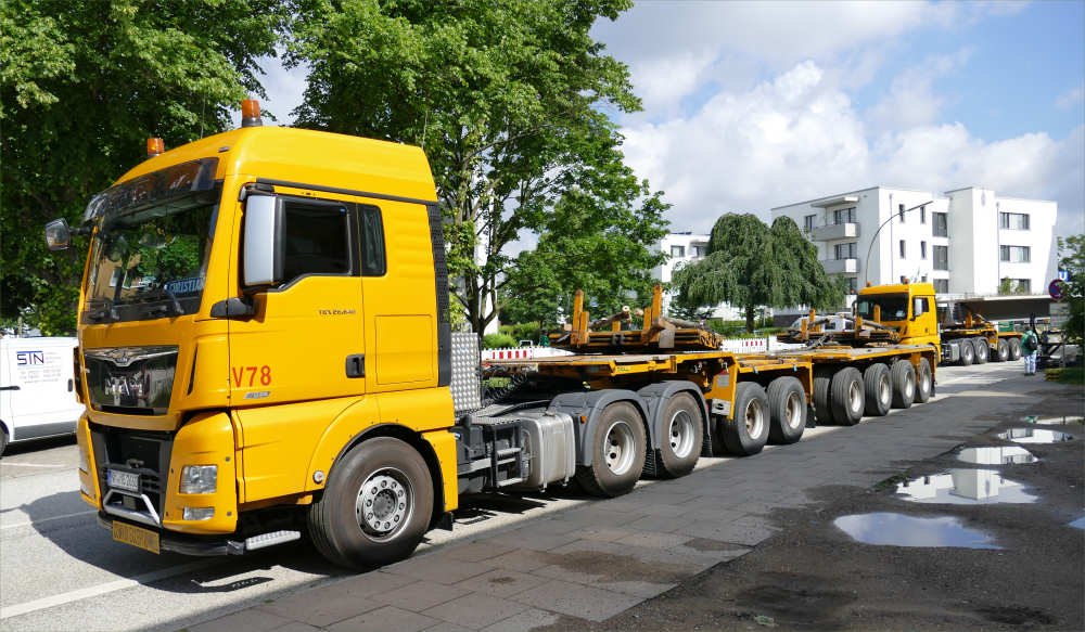 Zweimal MAN 26.4540 TGX Euro 6 6x4 Zugmaschine mit Doll Nachläuferzug und Brückenbinder