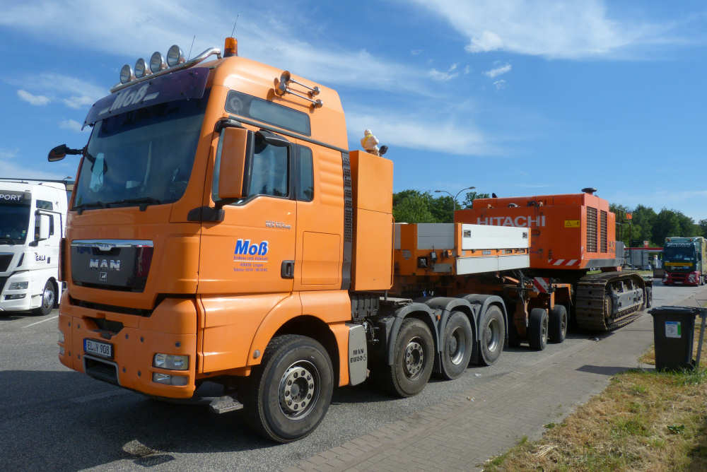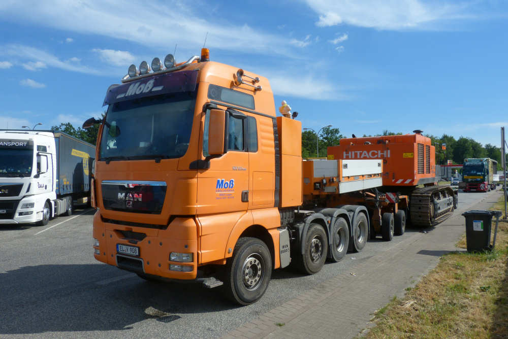 Dieser Transport von Moß Abbruch, aus Lingen, stand im Mai 2018 auf dem Rasthof Buddikate Ost an der A 1.