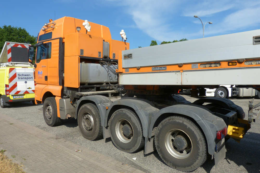 Die Schwerlastkombination bestand aus MAN 33.540 8x4 TGX und Goldhofer THP XLE 2/4 Tieflader mit Baggerbrücke.