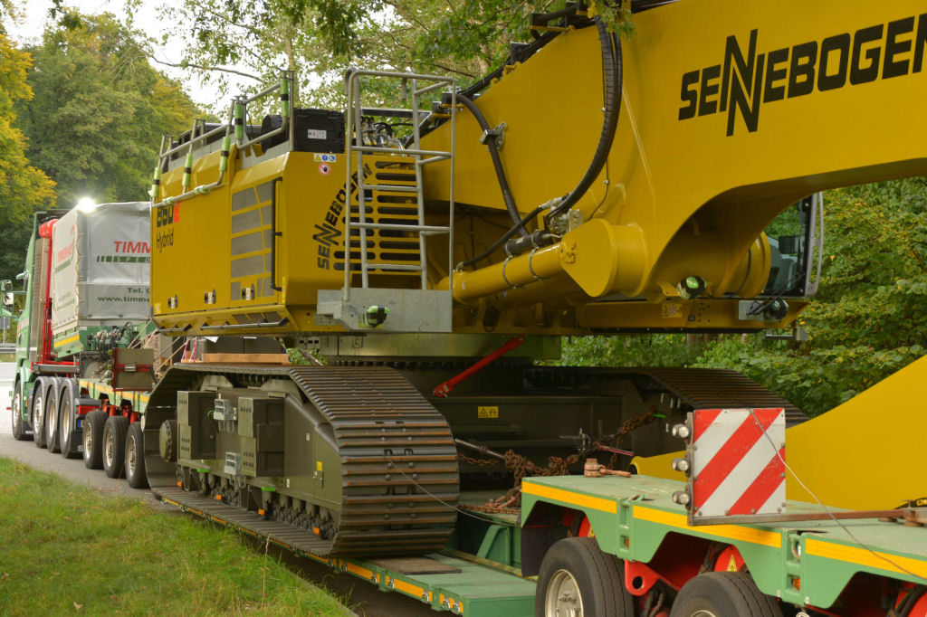 Scania R 580 8x4 mit Scheuerle Nicolas 4-6 Eurocompact Tieflader und Sennebogen 860 E Hybrid Umschlagbagger